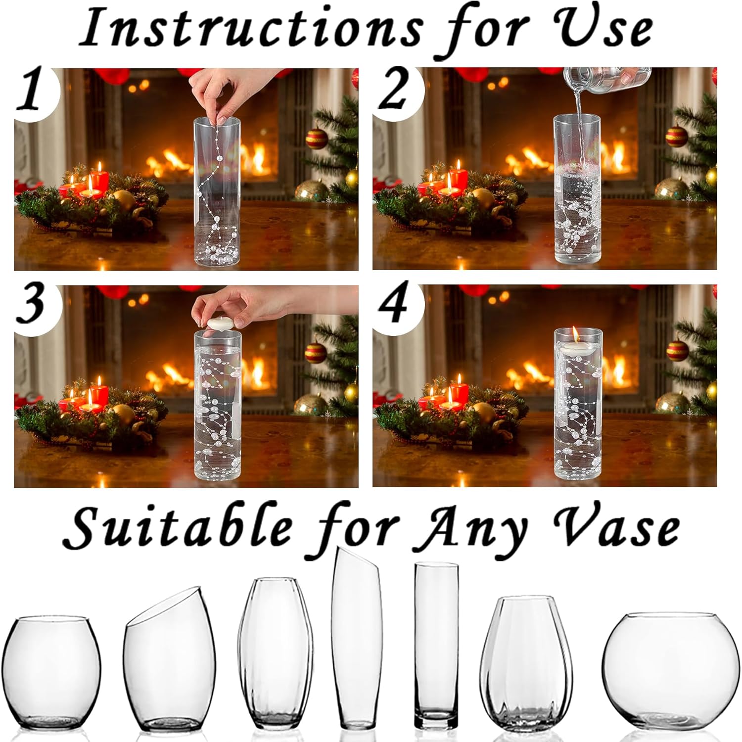 • Pearl String Beads: These artificial fake pearls strands are designed for floating candles, easy to use, just fill the string beads into the floating candle glass candle holders; you can also fill the vase with water and add 2 or 3 strands of beads string, which will make the centerpiece more romantic and gorgeous, for tall or large vases, just fill it with more strands of pearl decorations to bring a rich and luxurious look to your precious vase filler