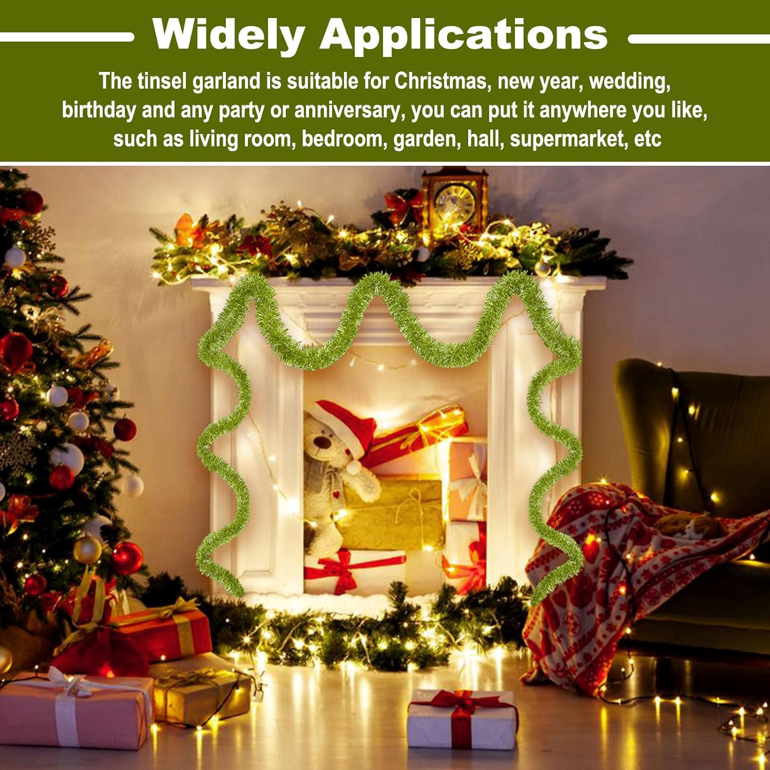 • Wide Application: Suitable for all kinds of special days, such as christmas, new year, valentine's day, halloween, festivals, wedding, engagement, bridal baby shower, graduation celebrations. The tinsel garland are perfect decorations for party, home decorations, parade float, garden, christmas tree, christmas wreath, wall, ceiling, door, hedge, stair rail, doorway, window, pole, table and so on