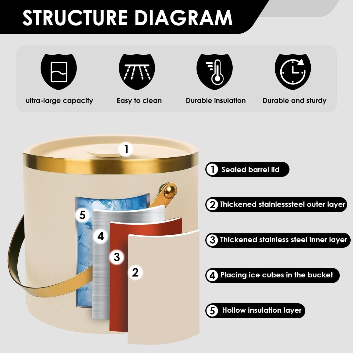 • 1.3-liter extra-large capacity insulated thickened stainless steel ice bucket, capable of holding more beverages. With a wide-mouth design, it's easy to grab and place items, making it perfect for parties.
