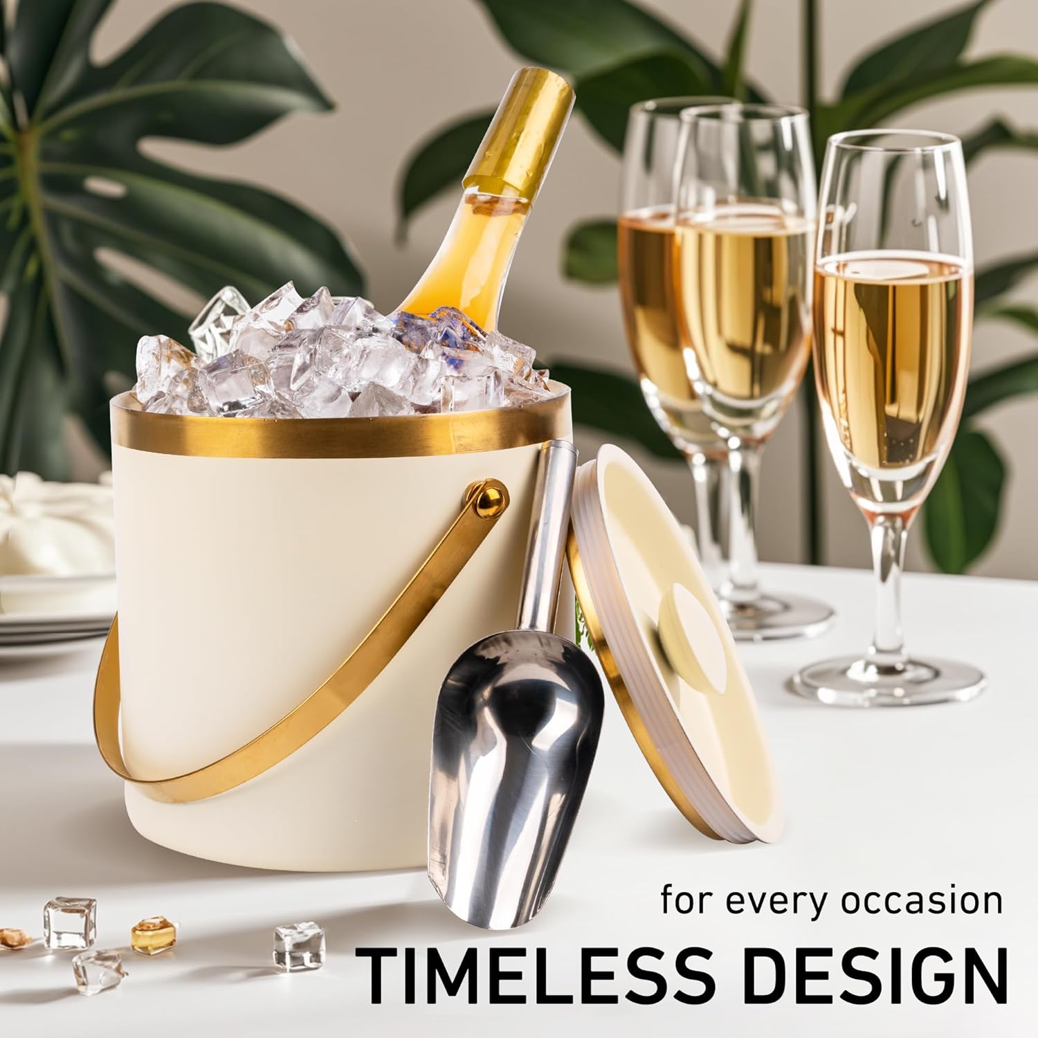 3L beige white Double Wall Insulated Stainless Steel Ice Bucket with scoop for Cocktail Bar,Metal Ice Bucket for freezer with Lid for parties.ice Container to Keep Ice Colder,bar cart accessories