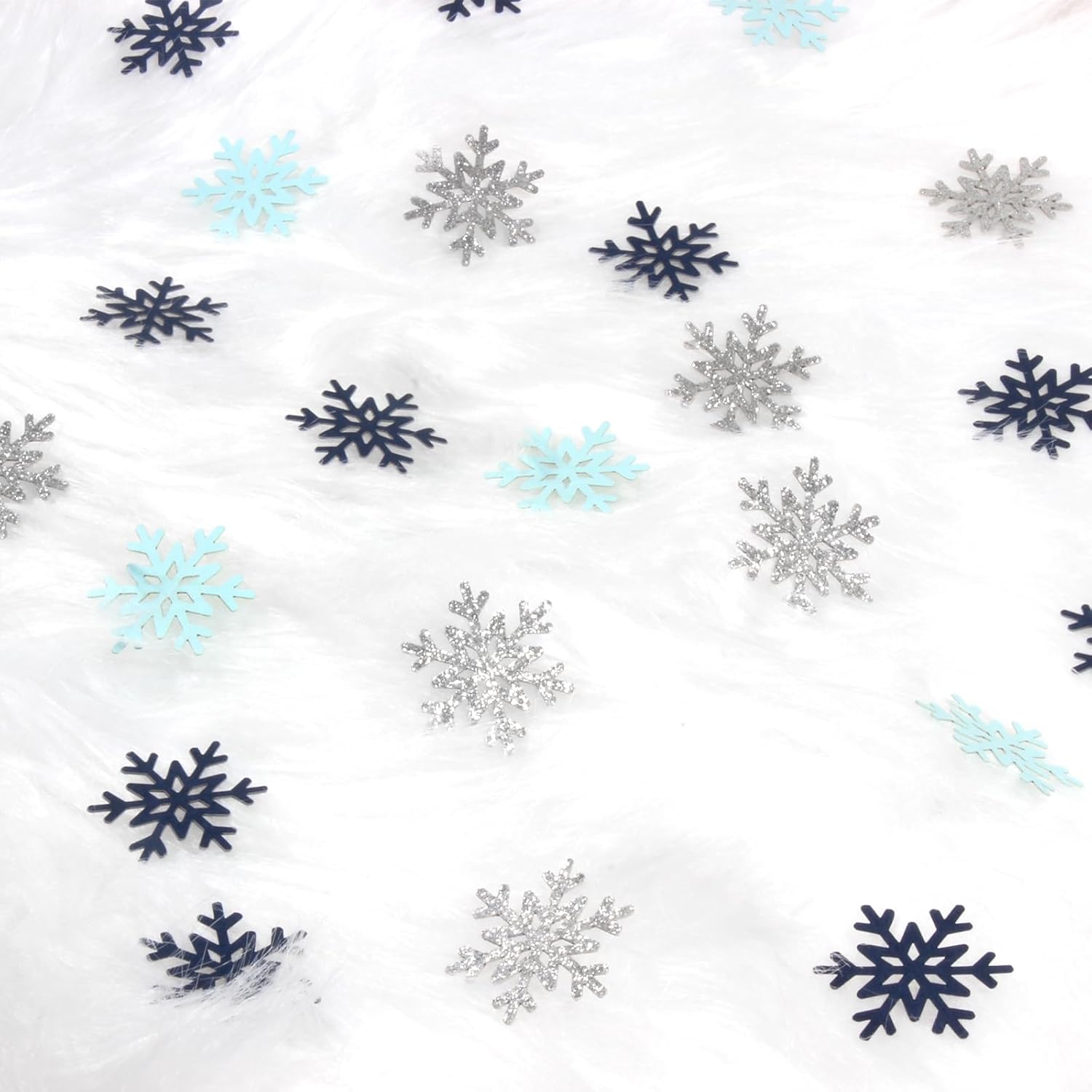 • Premium quality,proper size.The small snowflakes for crafts are made from premium glittery silver paper card and well cut,the colors matched well.The baby blue snowflake decor confetti size is 1.2inch,perfect for holiday crafts,recommend as table decorations or craft supply.