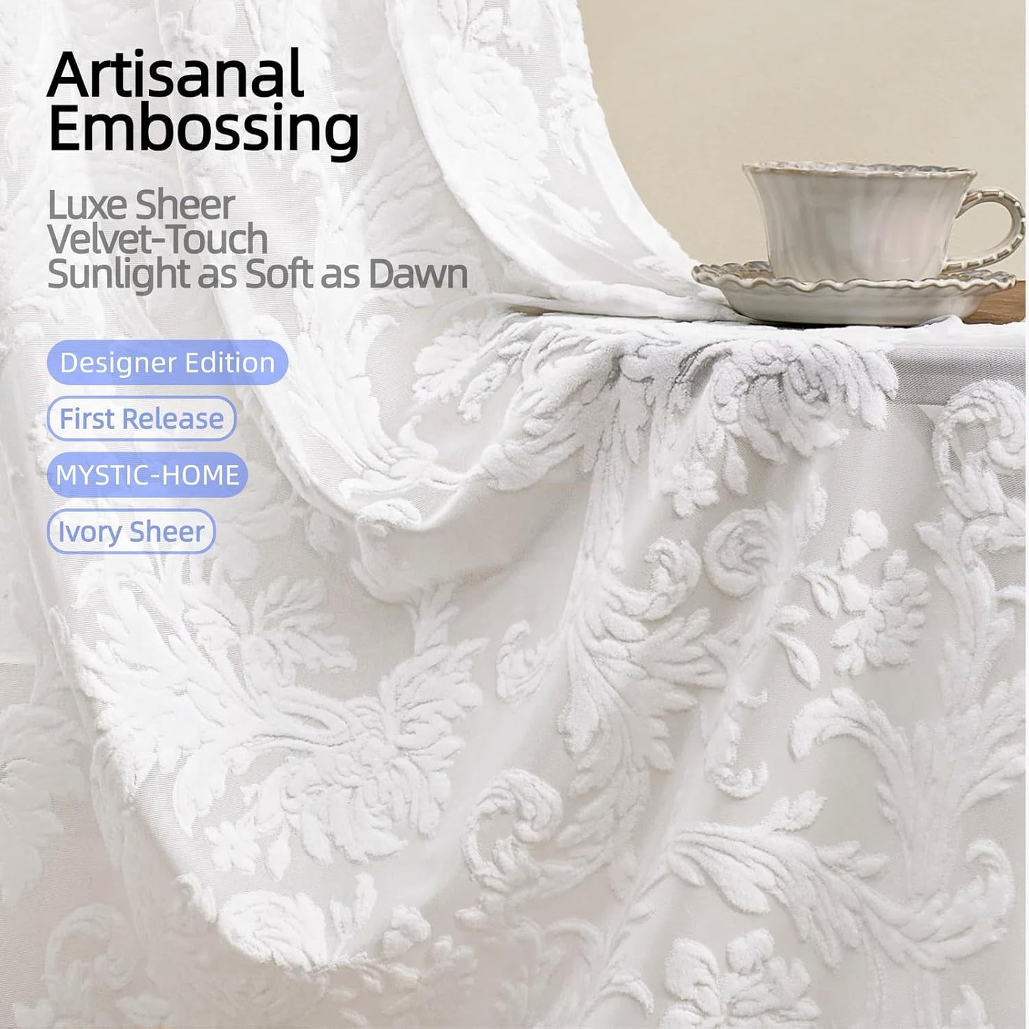 • Cloud-Soft Velvet-Touch Fabric Experience Luxe Sheer quality with thermal-insulated Ivory Sheer voile. The Crush-Resistant fabric retains its Artisanal Embossing texture even after packing, while UV Block 75% protects your interiors from harsh sunlight.