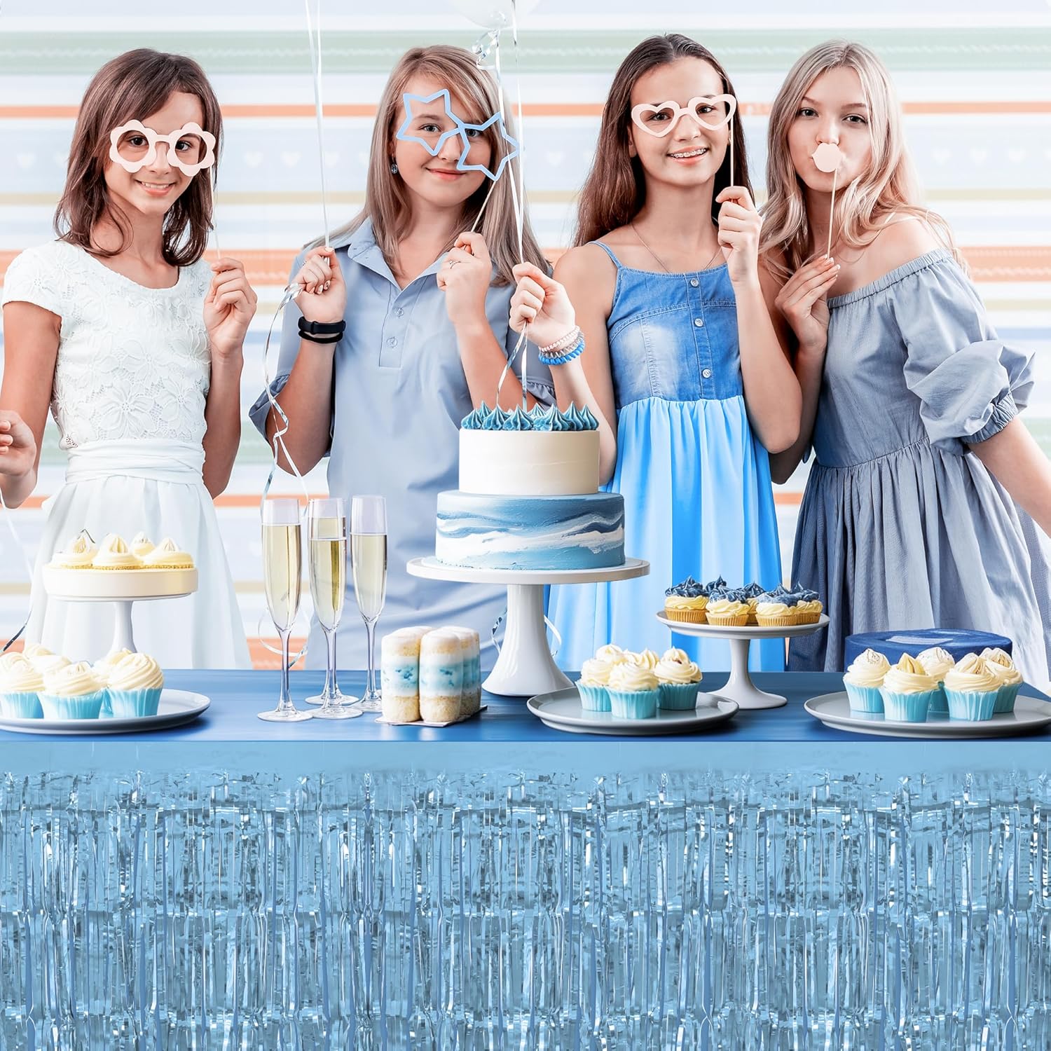 1 Pack Light Blue Table Skirts, 29x108" Metallic Foil Tinsel Fringe Table Skirts for Rectangle Tables Streamer Curtains Backdrop, Party Decorations for Birthdays Weddings Holidays