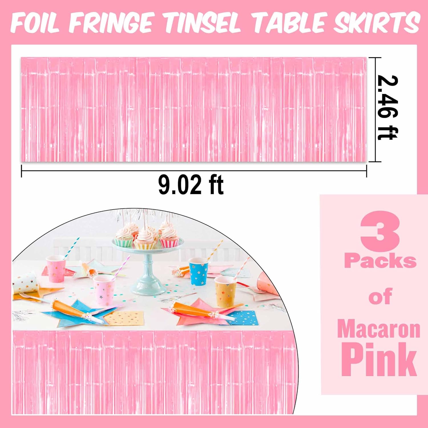 3 Pack 29 x108 Inch Macaron Pink Foil Fringe Table Skirts Metallic Banner for Tinsel Streamer Garland Backdrop for Parade Floats Mother's Day, Graduate, Birthday, Wedding Party Decoration