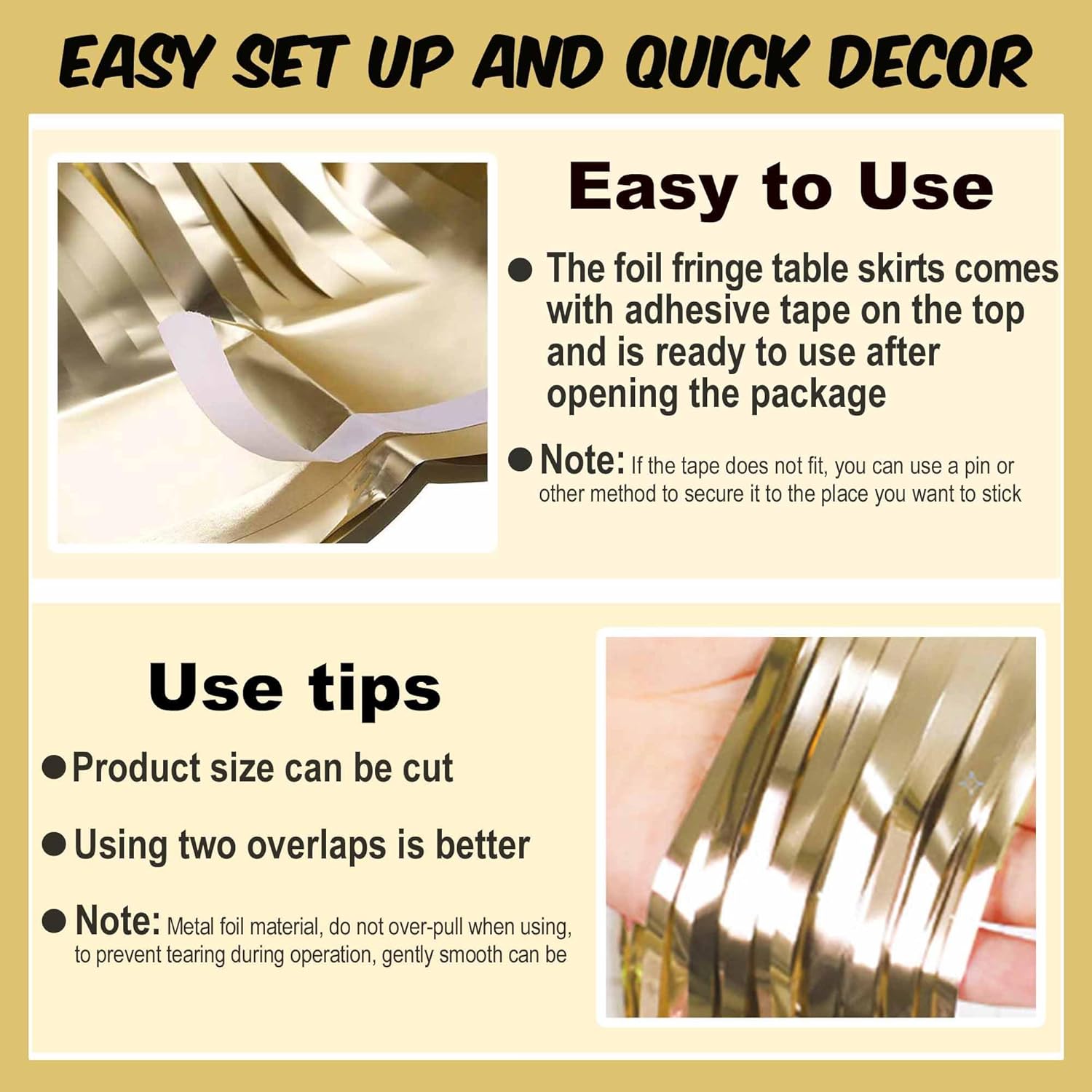 • Easy to Use: Each metallic fringe table skirts comes with self-adhesive tape on the top for easy attachment to your wall or table, just peel off the tape and then stick, easy and fast to install.