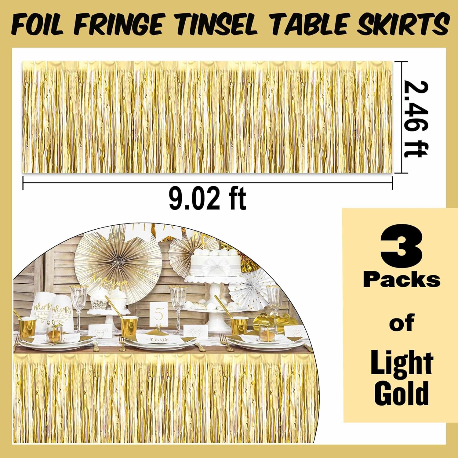 3 Pack 29 x108 Inch Light Gold Foil Fringe Table Skirts Metallic Banner for Tinsel Streamer Garland Backdrop for Parade Floats Mother's Day, Graduate, Birthday, Wedding Party Decoration
