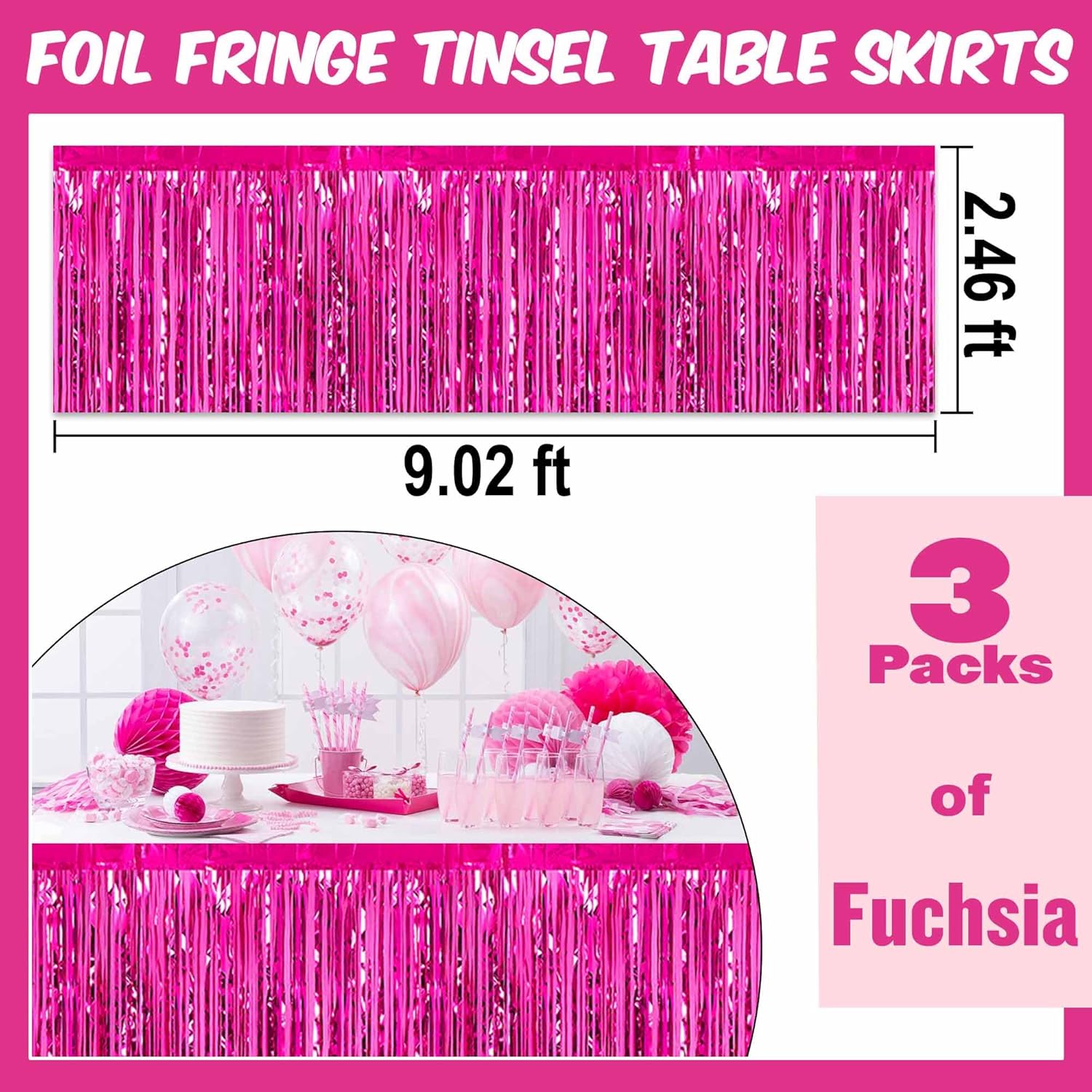3 Pack 29 x108 Inch Fuchsia Foil Fringe Table Skirts Metallic Banner for Tinsel Streamer Garland Backdrop for Parade Floats Mother's Day, Graduate, Birthday, Wedding Party Decoration