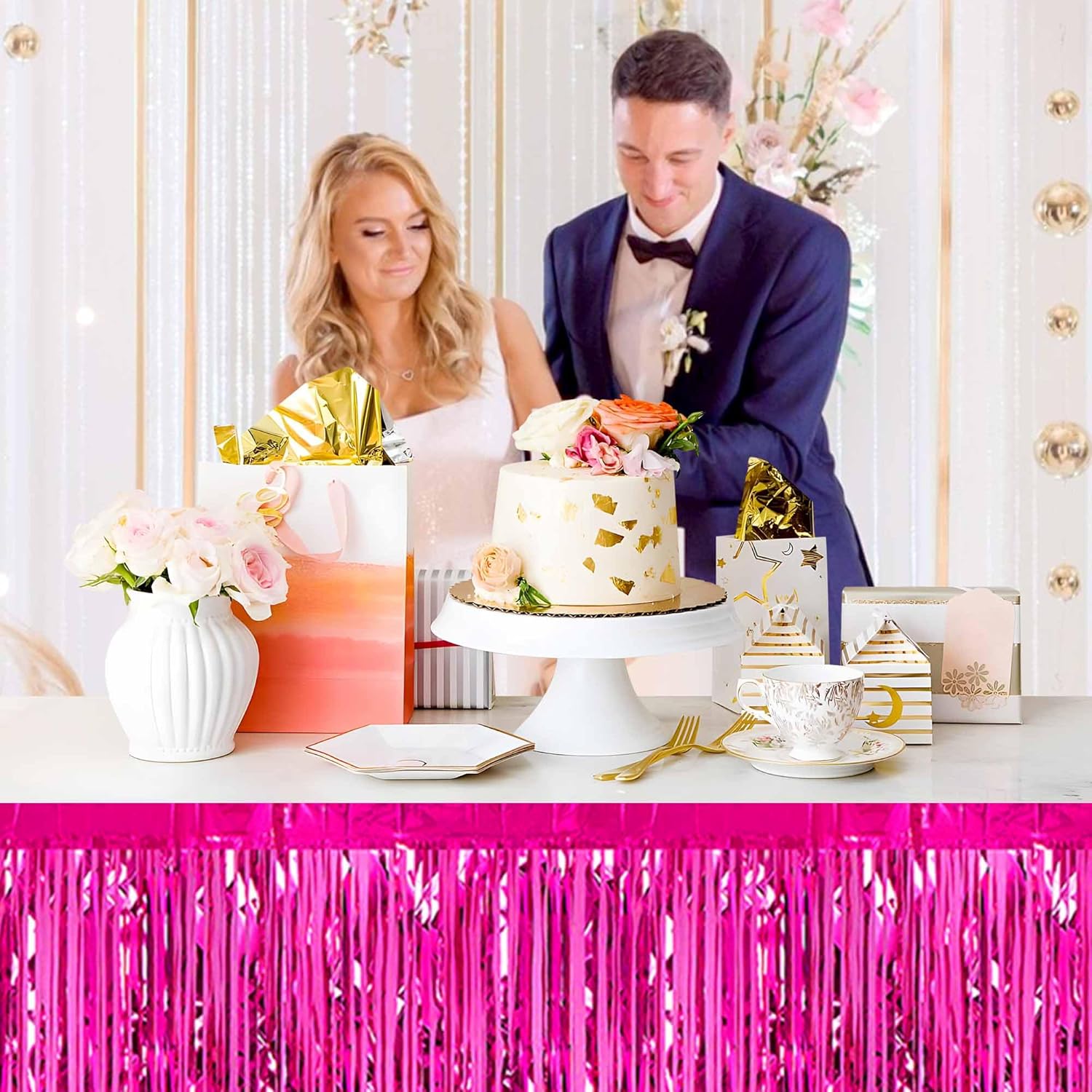 • Multiple Colors: Pair with metallic foil fringe table skirt of different colors to achieve the color combination you want. Show off your creativity by pairing this gold foil wall hanging table skirt with other garland in different colors to fulfill your dream of creating the perfect party scene.