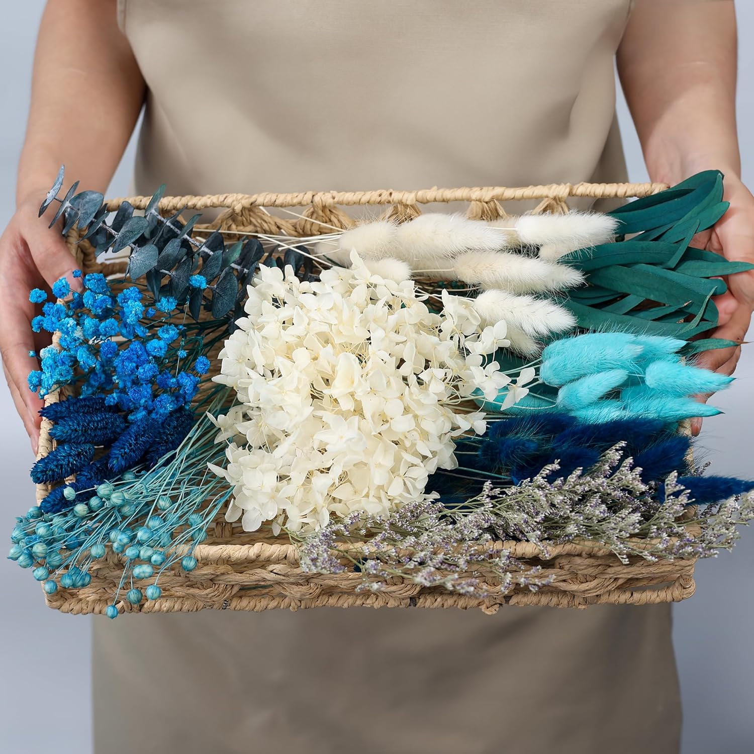 • MATERIALS: blue premium mixed dried flowers contain 10 different colours of natural dried flowers, specifically white and peacock blue hare's tail flowers, eucalyptus leaves, sea lavender, hydrangea, blue baby's breath flowers, fuchsia beans, and comes with DIY twine accessories.