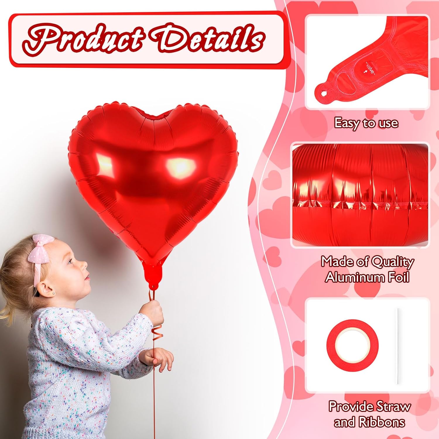 • Package includes: You will receive 24 pcs 18 inch heart foil balloons, a roll of ribbon, and a straw in sufficient quantity to meet your decoration needs. It is the perfect supplement to your party decoration, bringing surprises to guests and having a pleasant party time
