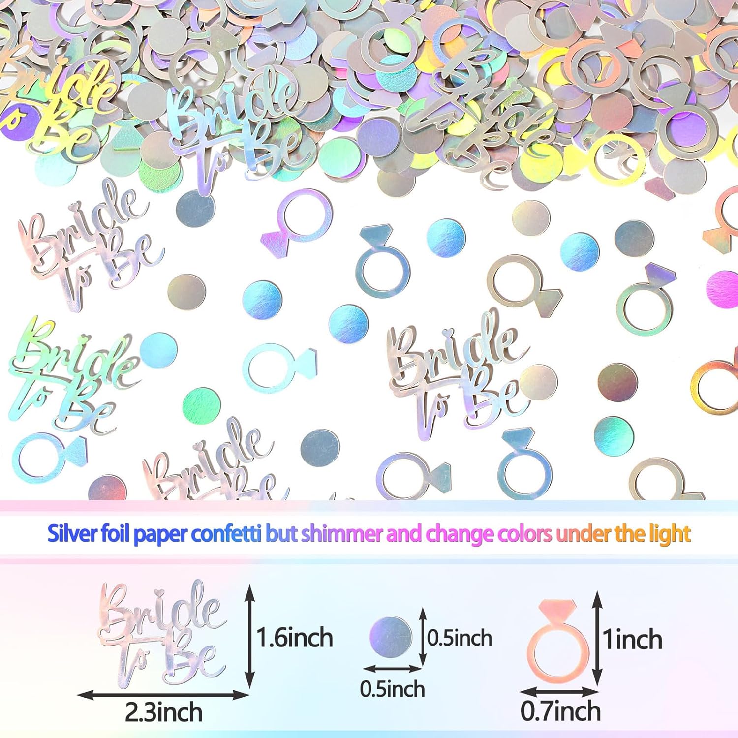 • Proper size and Great material.The ring bachelorette table scatters size is 1inch,the circle dot inside the ring is 0.5inch,bride to be letter 2.3*1.6inch.Material is shimmering silver foil paper cardstock,fitting well for iridescent party decor.