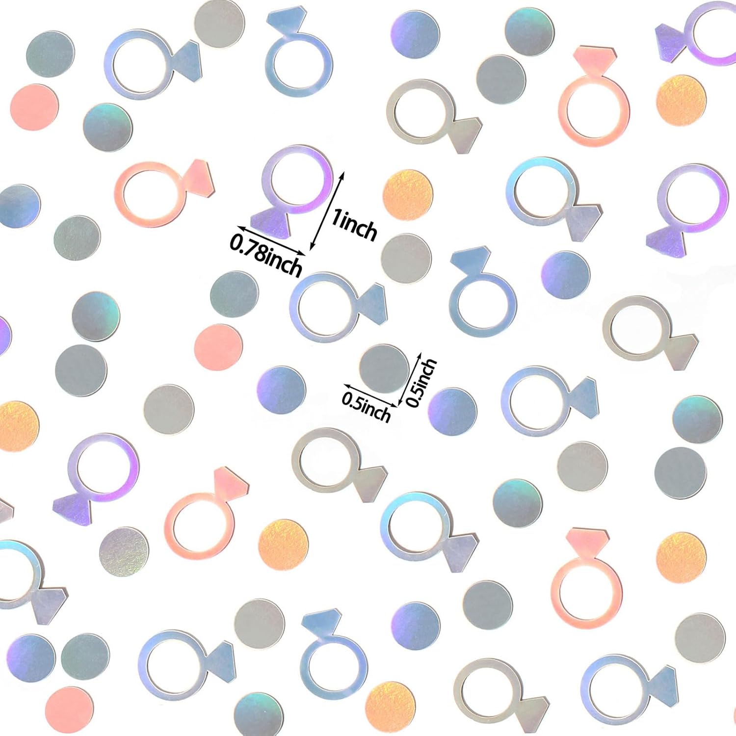 • Proper size and Great material.The ring wedding table scatters size is 1inch,the circle dot inside the ring is 0.5inch.Material is shimmering silver foil paper cardstock,fitting well for iridescent party decor.