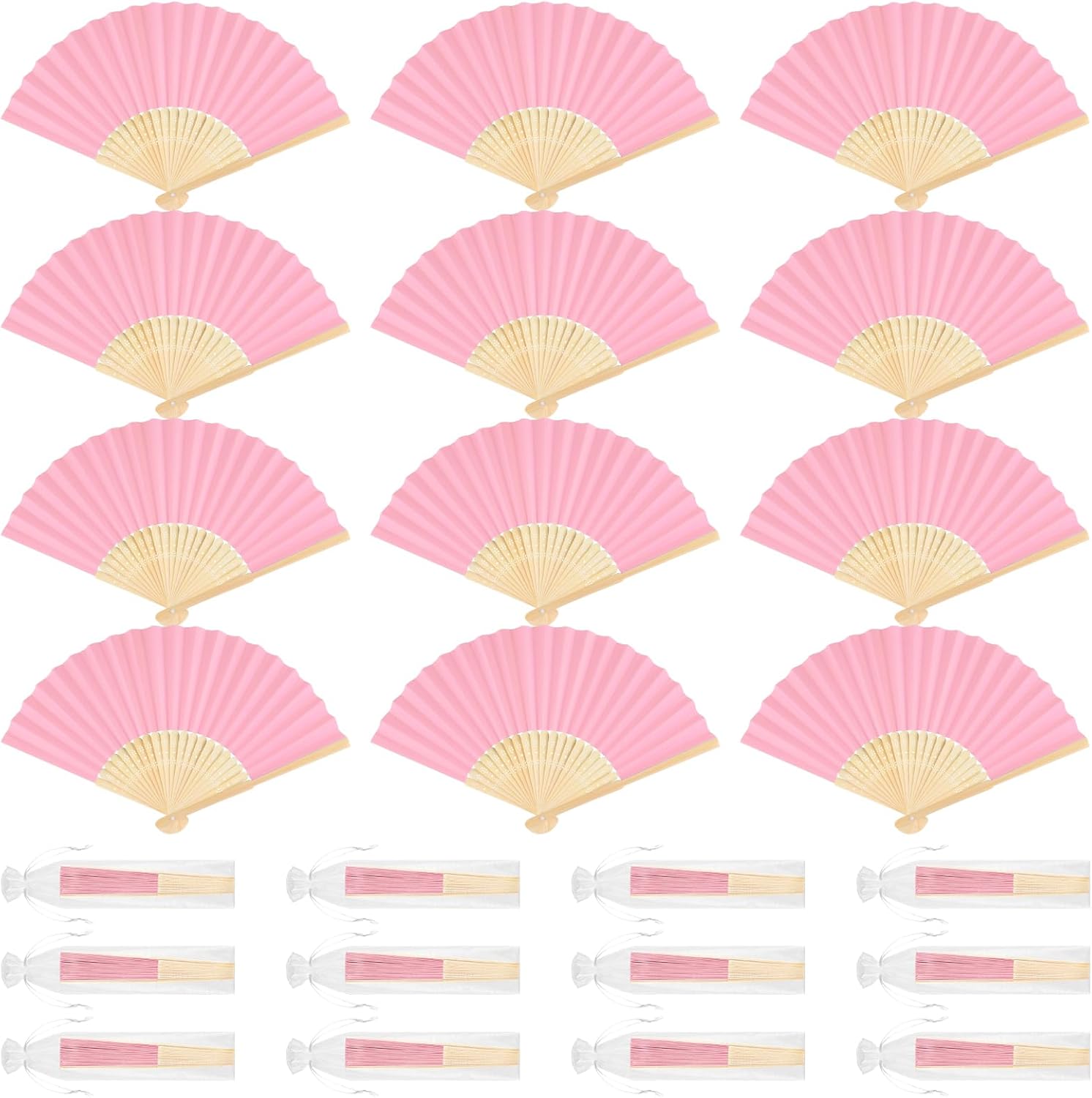 12 Pieces Pink Hand Held Bamboo Folding Fans Paper Fans Handheld for Women Foldable Girls Wedding DIY Decoration Church Home Party Favors Summer