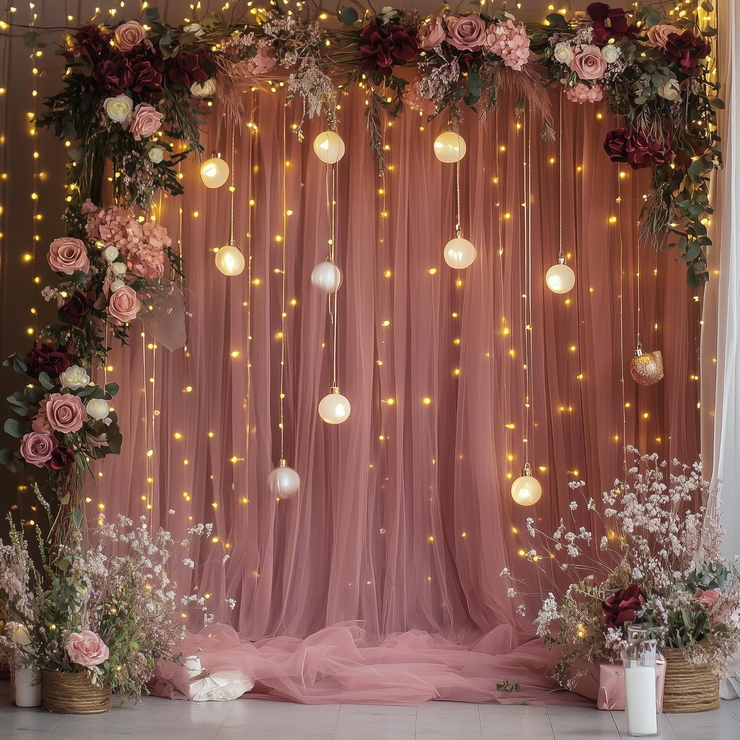 • Package Includes: 2 panels dusty rose tulle backdrop curtains, each sheer curtain backdrop is 5FT width and 8FT height. Also it includes a set of 10FT (10 strands) warm string light (USB powered,no remote control) and 12pcs transparent clips.