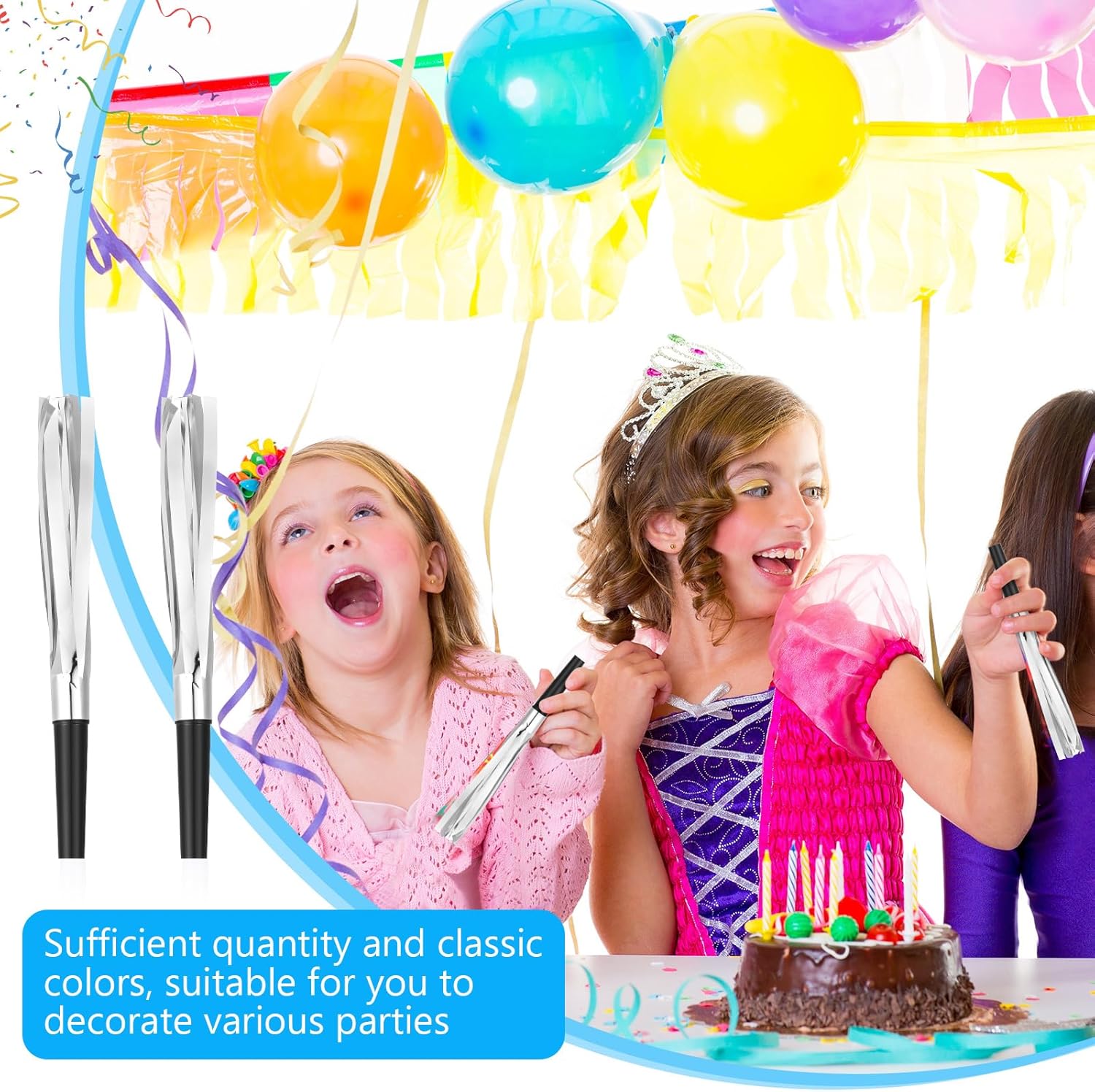 • Fun Party Favors: Set of 24 metallic fringed noise makers in gold and silver colors, perfect for celebrations like New Year's Eve, birthdays, and baby showers.