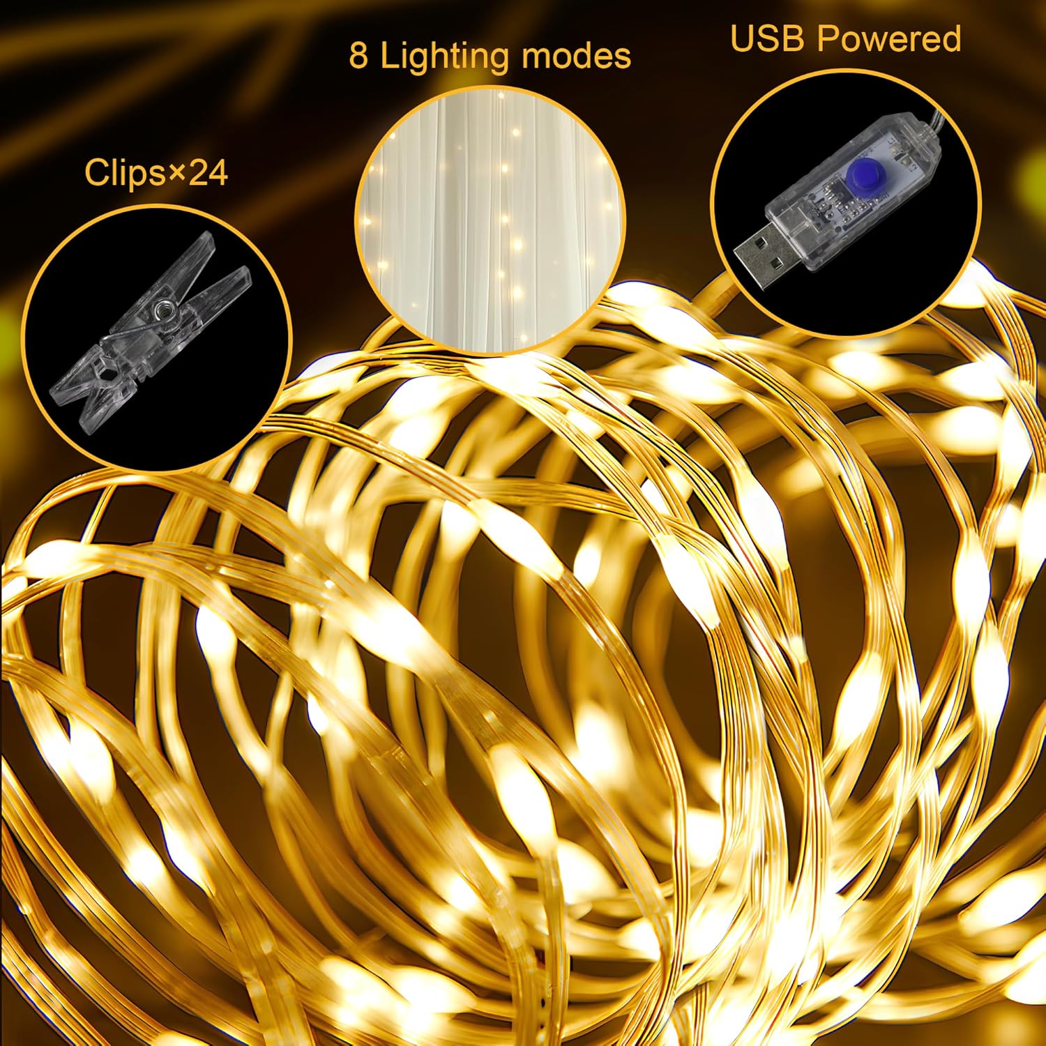 • Package Includes: The package includes 4 panels Ivory sheer tulle backdrop curtains, each curtain backdrop is 5FT width and 10FT height. Also it includes 2 set of 10FT (10 strands) warm string light (USB Powered) and 24pcs transparent clips.