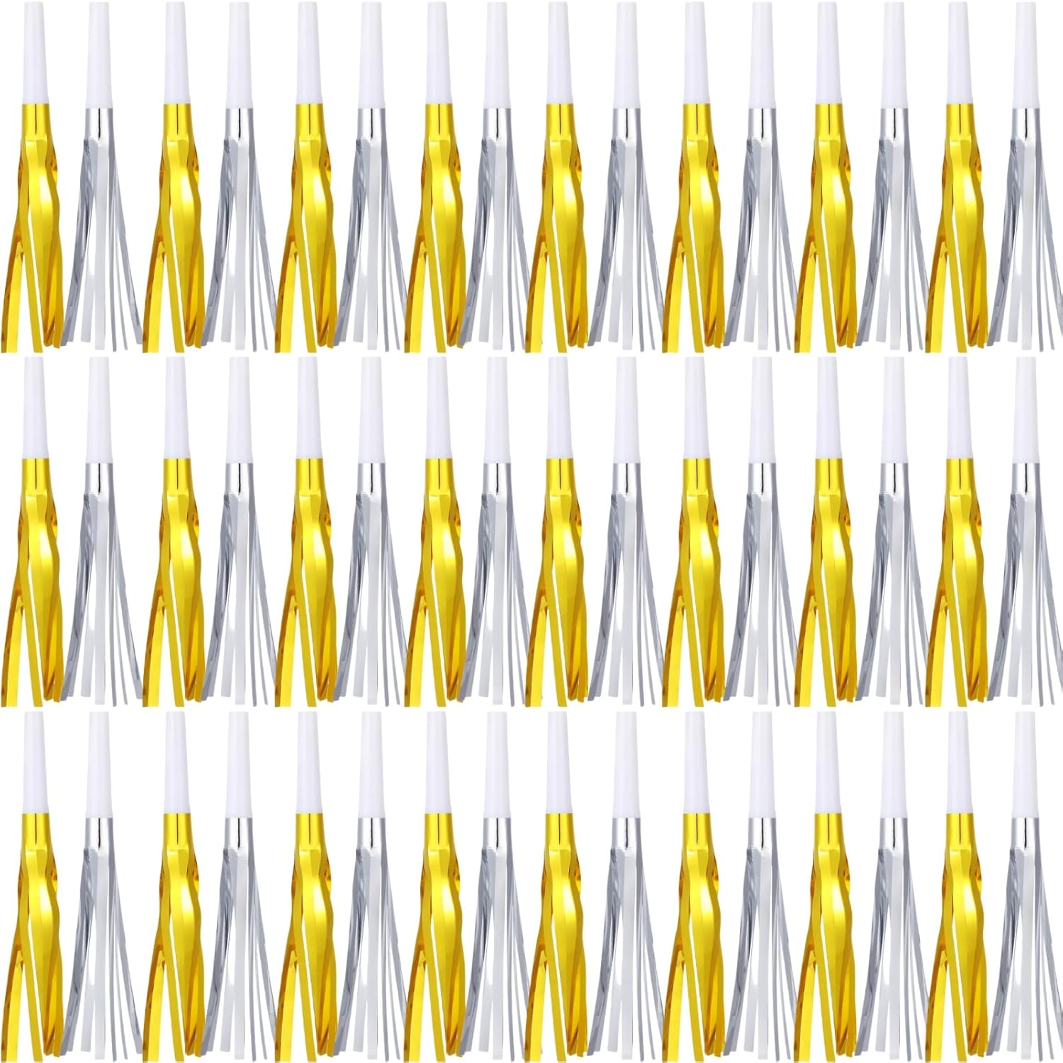 • Fun Party Favors: Set of 48 metallic fringed noise makers in gold white and silver white colors, perfect for celebrations like New Year's Eve, birthdays, and baby showers.