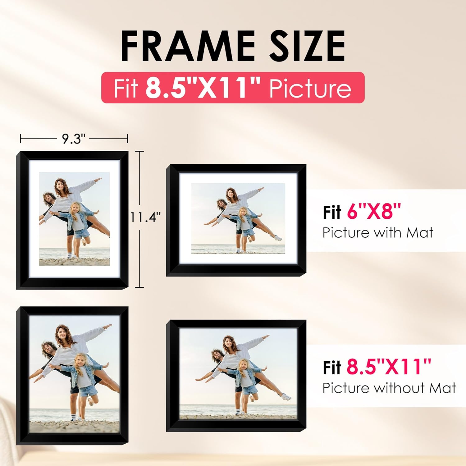 • Versatile Display: The 8.5x11 picture frames can showcase 8.5x11 photos without a mat, or with a mat, they can accommodate 6x8 photos, allowing you to layer and enhance the visual appeal of your pictures.Cherish your special memories and create a personal gallery that reflects your unique style and personality.