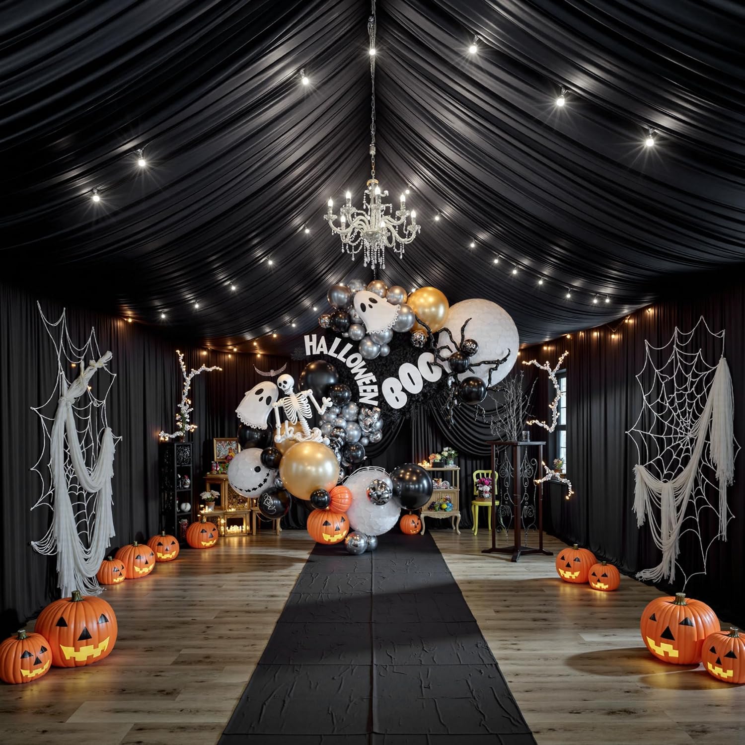 PartyVillage 20ftx40ft Black Ceiling Curtain for Halloween Parties – 4 Panels Wrinkle-Free 40 FT Long Tent Draping Curtains for Wedding, Birthday & Theme Parties, 40ft Height with Rod Pocket