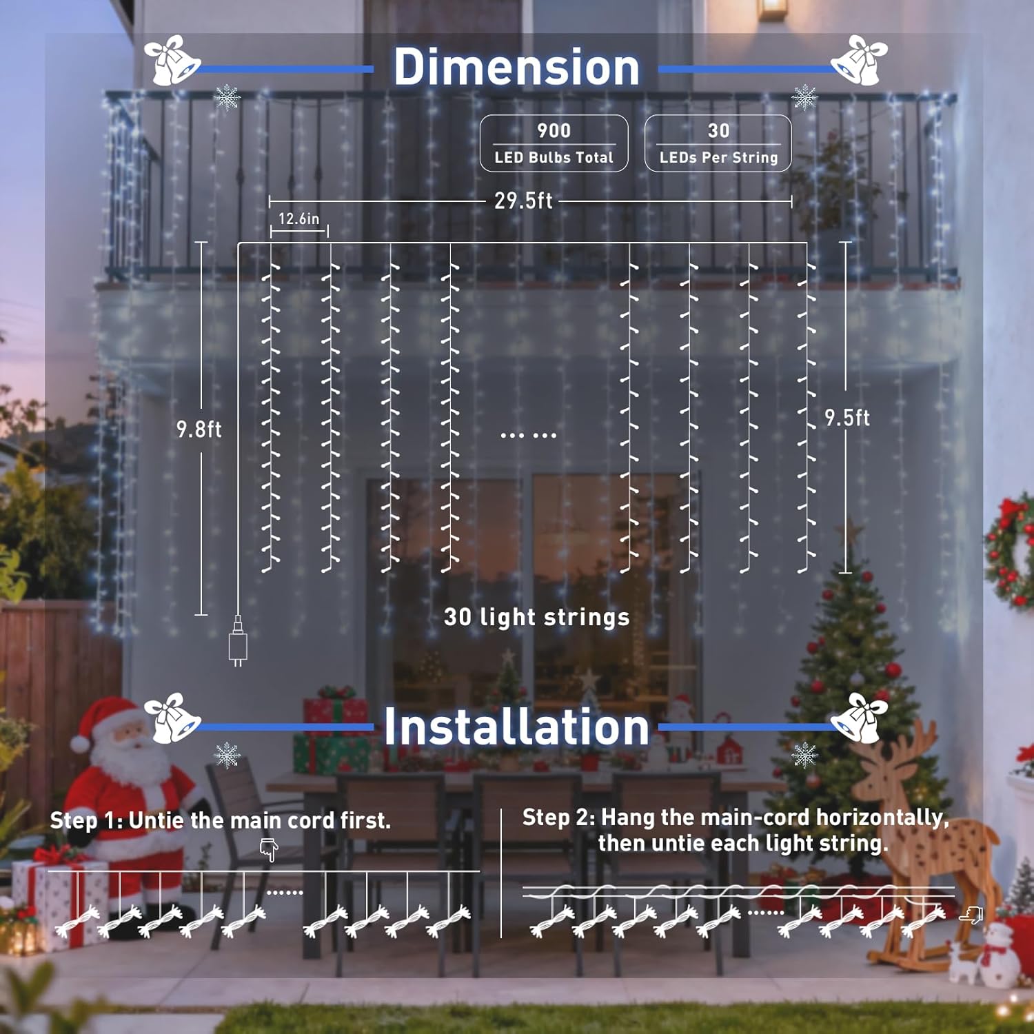 • ULTRA-LONG 900 LED CHRISTMAS CURTAIN LIGHTS: The Christmas curtain lights come with 30 light strands, each containing 30 LEDs for a total of 900 LEDs. It gives off a cool white, soft glow, and really adds a nice touch of oomph to your Christmas. The 9.5x29.5ft extra-long white Christmas curtain lights make them sufficient to cover windows and walls, great for your Christmas decor. NOTE: for stability of light brightness, multiple sets of the white curtain lights can NOT be connected.