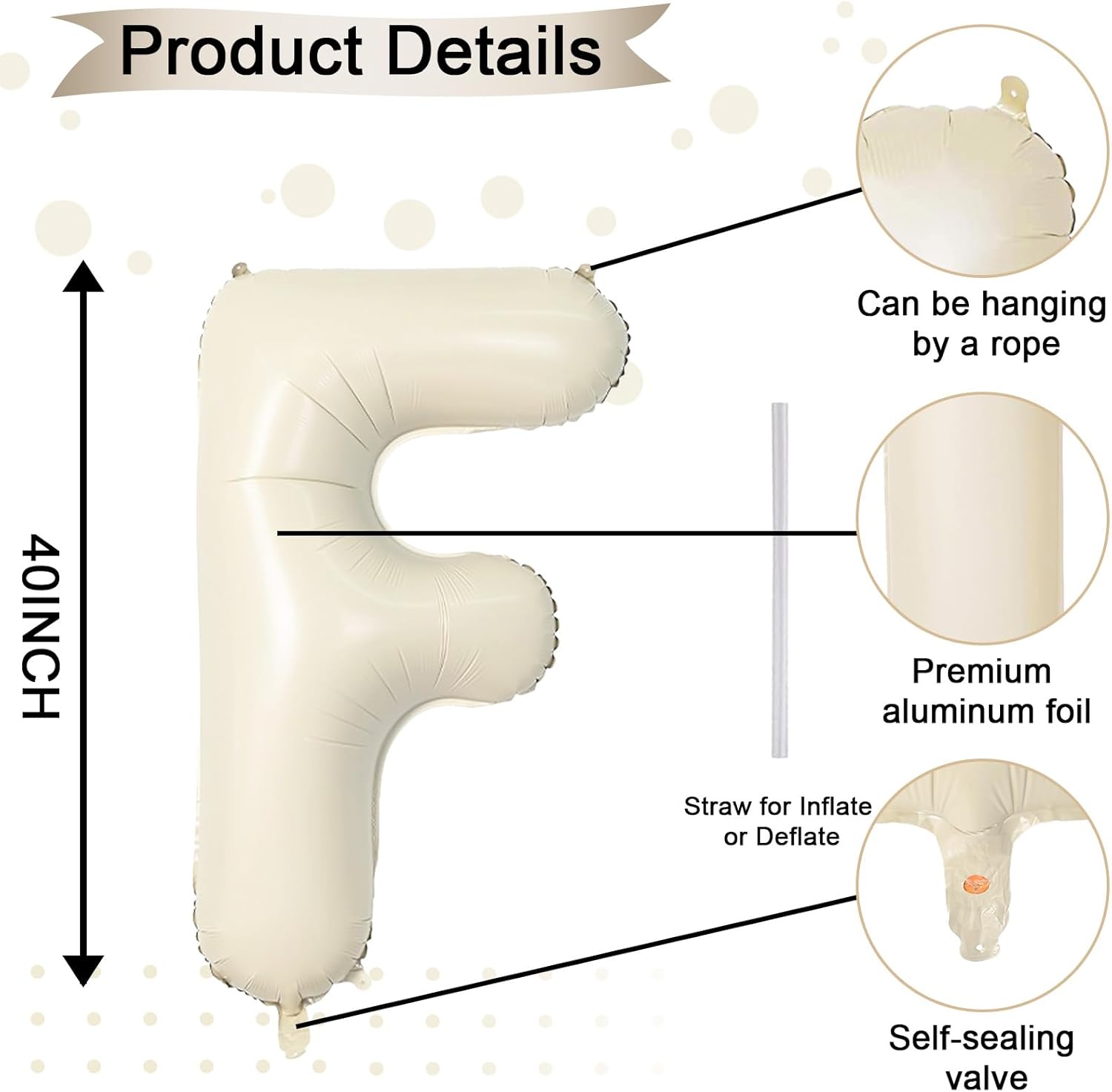 • Cream White Letter F Balloon 40 Inch: Includes 1pc giant beige "F" letter balloon and 1 straw for easy inflation and deflation. Our elegant big beige balloons are perfect for personalized parties. With 26 letters (A-Z) and numbers (1-9) available, you can mix and match to fit your theme.