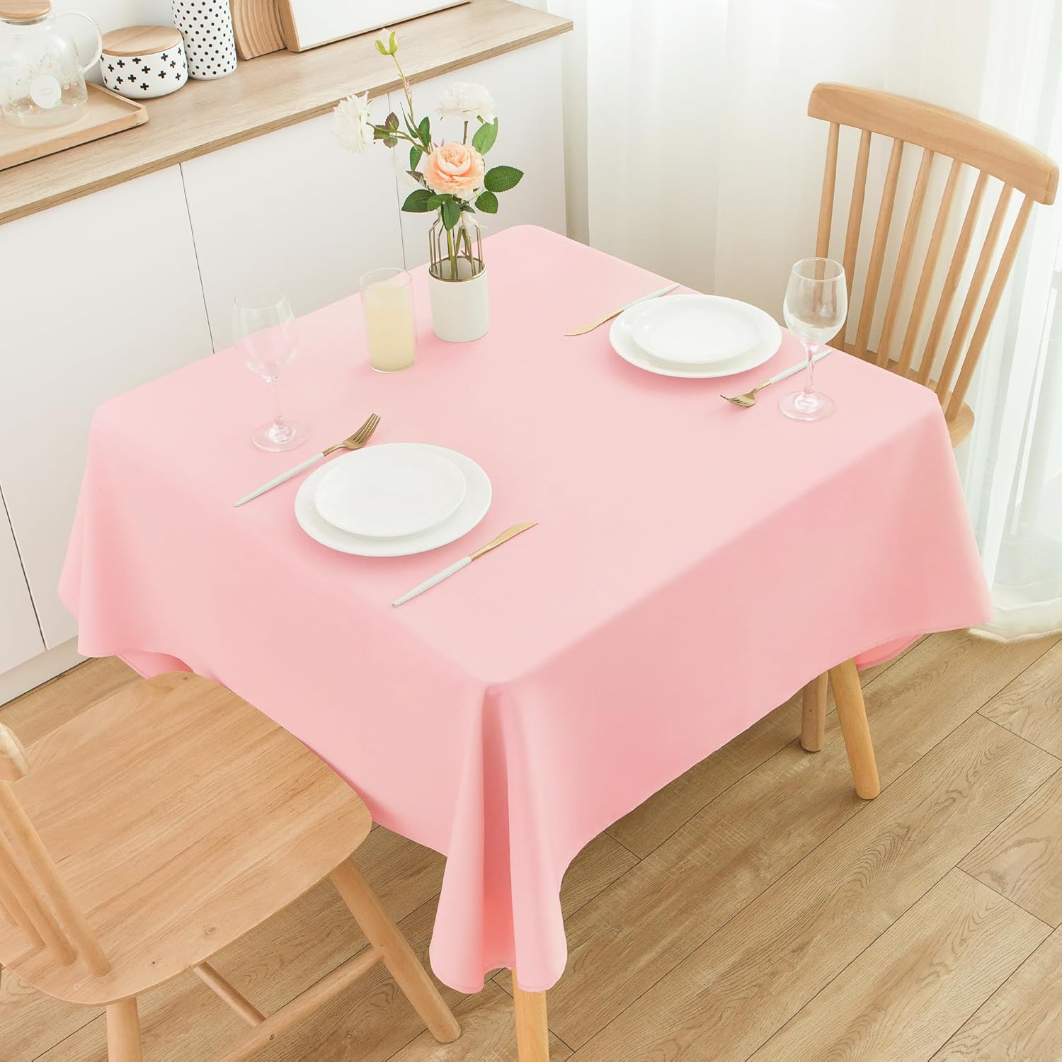 • Size Guide: Each package contains 2 PCS tablecloths. Each square pink tablecloth is 60X60 inches, recommended for square tables from 36X36 inches to 44X44 inches, such as dining tables, coffee tables, tea tables, kitchen tables, garden tables and other tables as long as they fit this modern table cloth, with a droop length about 8 inches to 12 inches. There may be a slight deviation due to manual tailoring