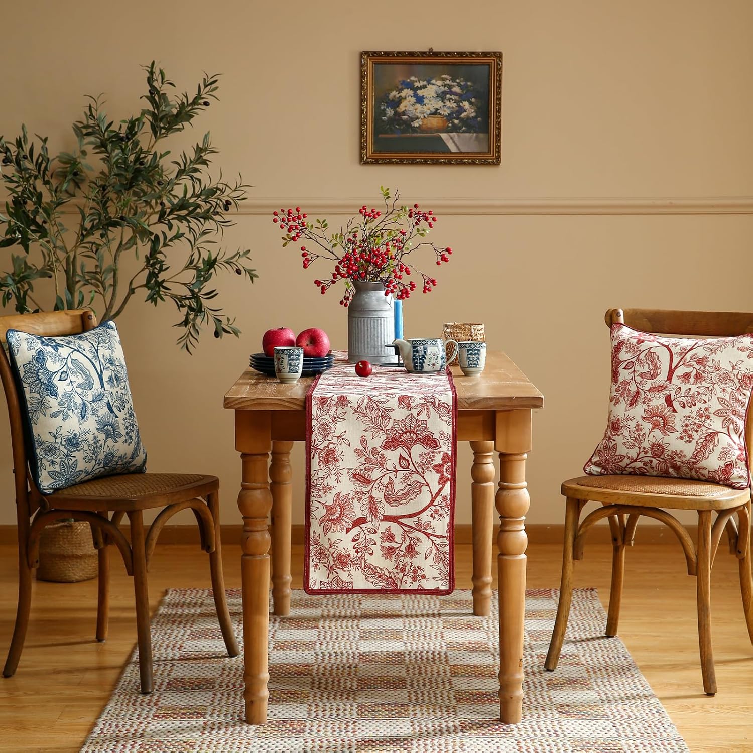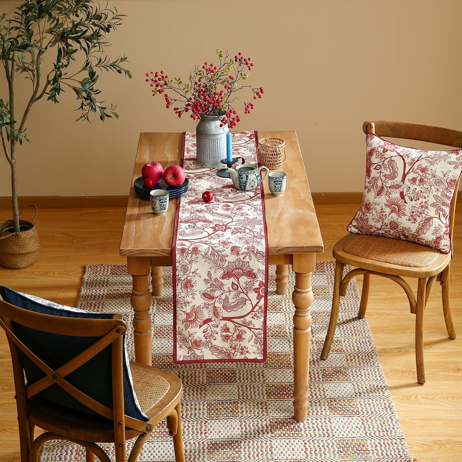 ISAENNE Designer Chinoiserie Elegant Linen Extra Long Table Runner 118 Inches,Red Floral Pattern Decor Table Runners for Thanksgiving,Dining Room,Banquet,Kitchen Tables,Christmas,12"*118"-Ruyi A