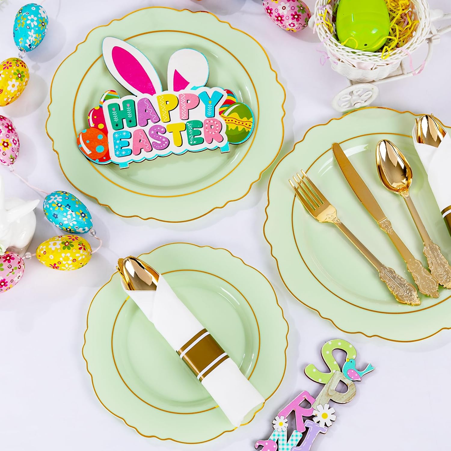 Liacere 350PCS Light Green Plates - Disposable Green and Gold Plastic Plates 50guest Baroque Dinnerware include 100Plates,50Pack Pre Rolled Napkins with Silverware 50Cups for Mother's Day