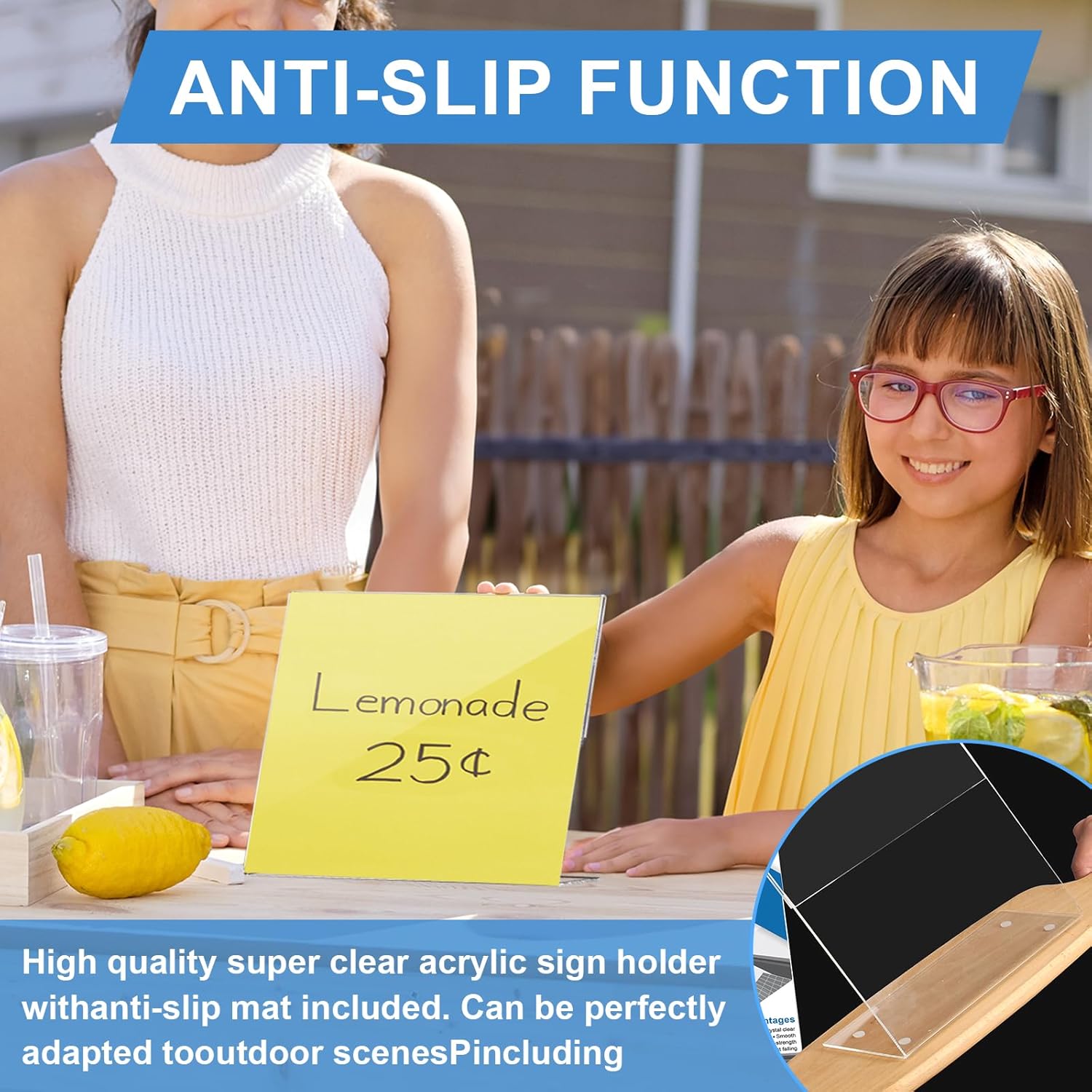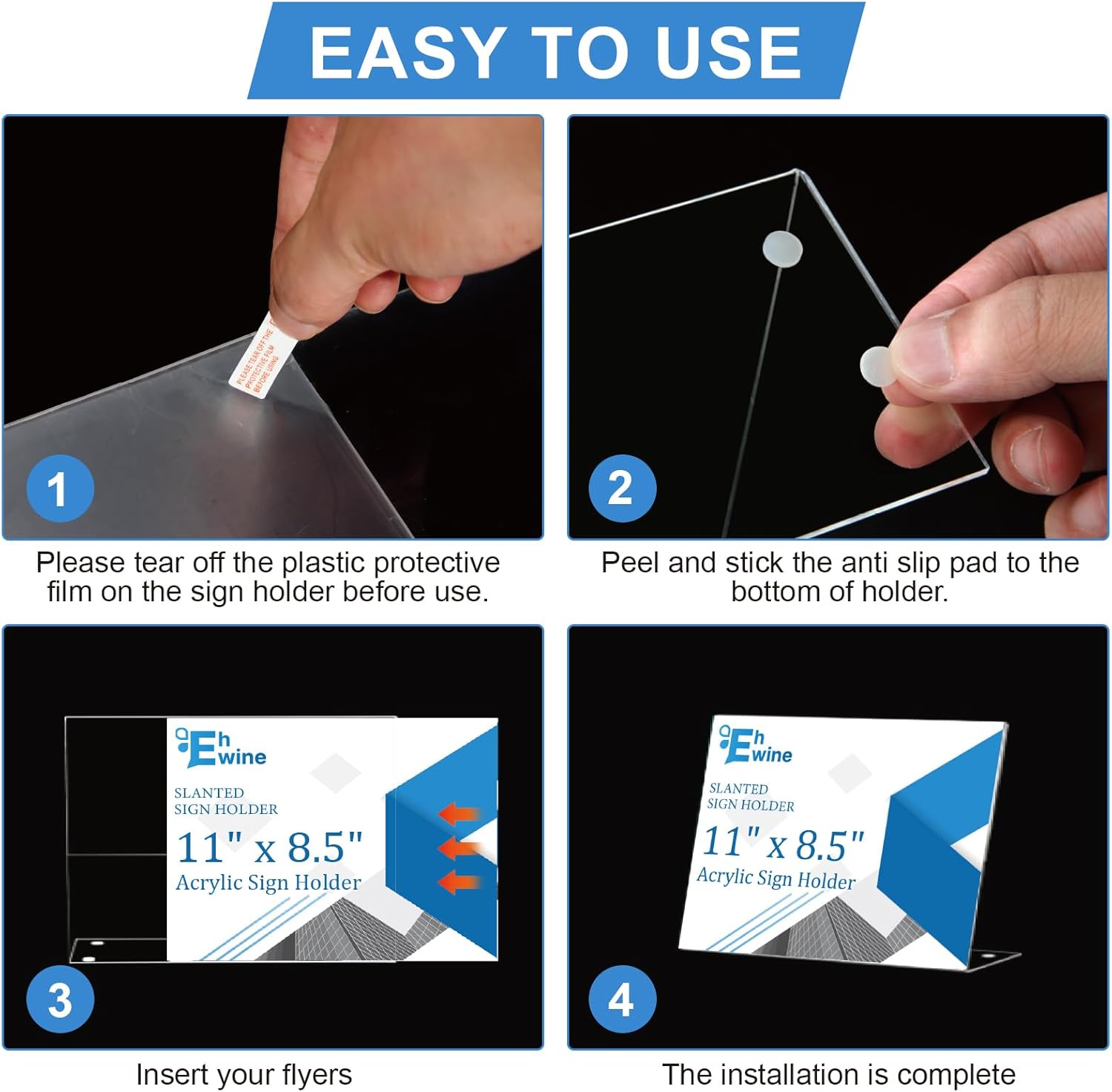 • Easy to Use: Insert 4 anti-slip pads into the base, Each of our Acrylic Sign Holder comes with a peel off film guide, follow the red arrows to peel off the film in seconds, and the plastic sign holder has an opening on its side for easy paper insertion