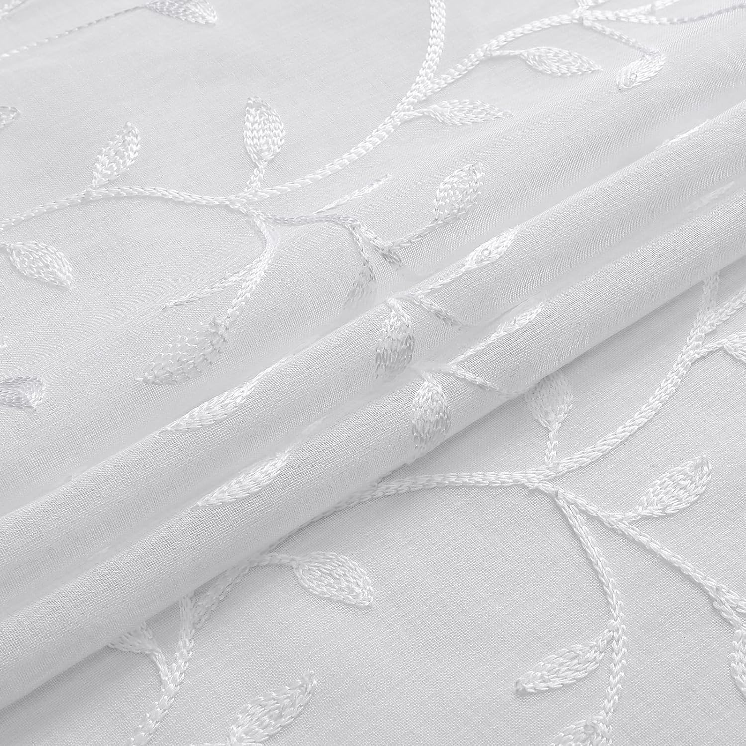 VISIONTEX White Sheer Voile Curtains, Decorative Beige Leaves Embroidery Faux Linen Rod Pocket Window Drapes for Home Kitchen, Living Room and Bedroom 54 x 63 Inch, Set of 2 Curtain Panels