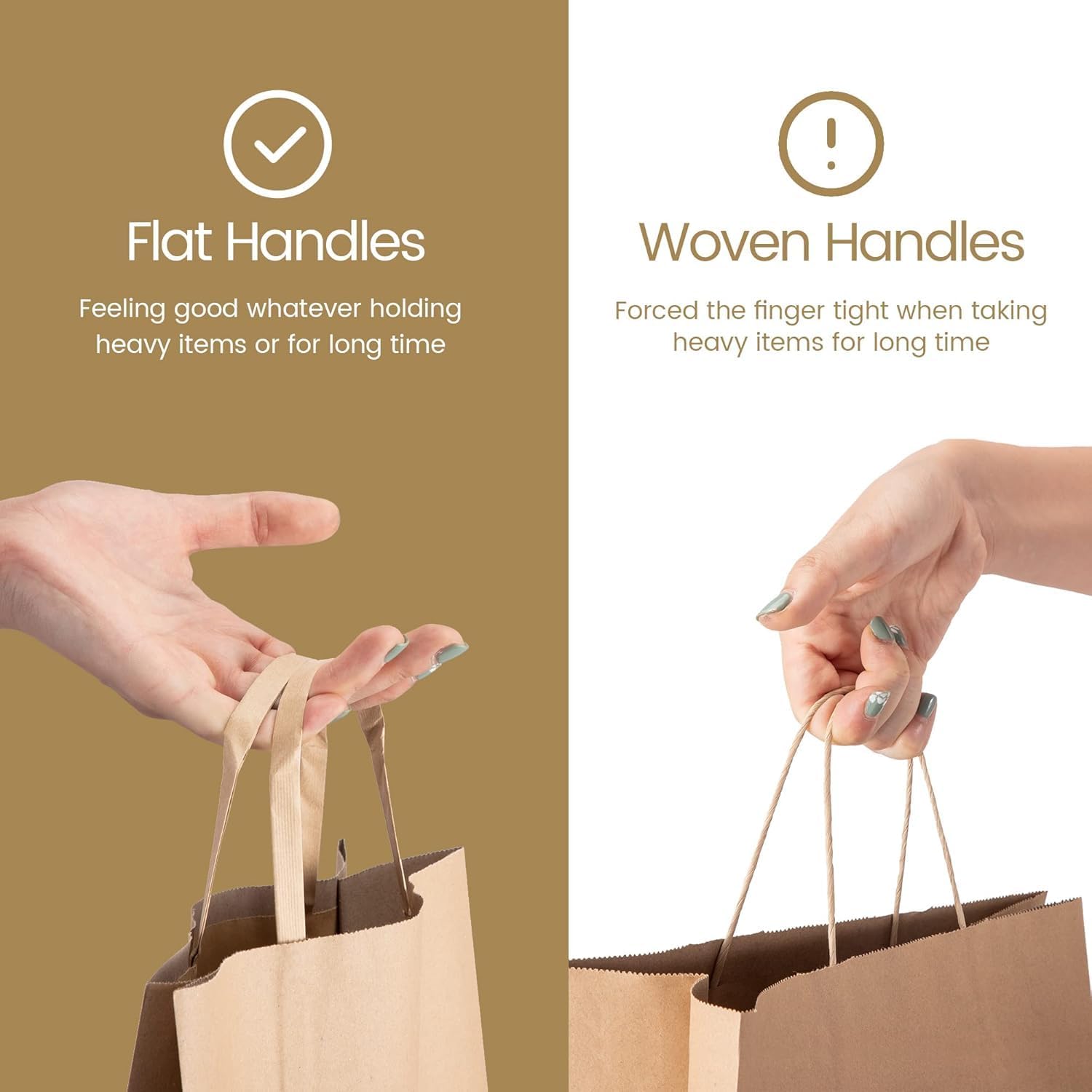 • GSSUSA Brown Bags with Flat handles - Size 10"X5"X13", a pack of 200 goodies bags, simple and smooth design, with a strong flat handle, giving a high-end feeling, and easy to carry. Suitable for various forms of small Gifts or commodities.