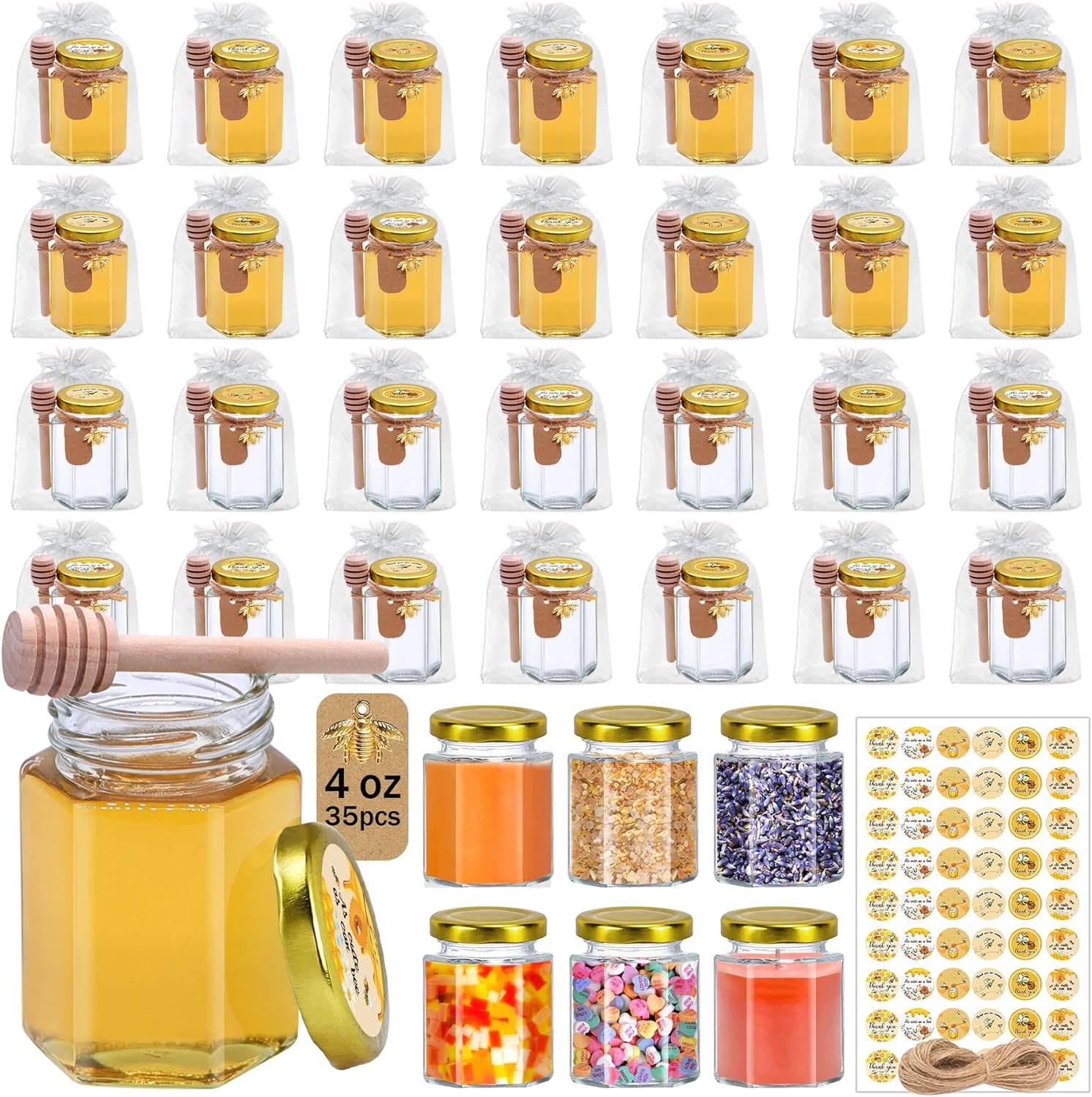 Aliggbent 35 Pack Small Honey Jars for Party Favors in Bulk, 4 oz Mini Hexagon Glass Honey Jars with Dippers, Lids, Cute Stickers, Bee Charms, Gift Bags & Jute for Baby Showers, Weddings, Birthdays