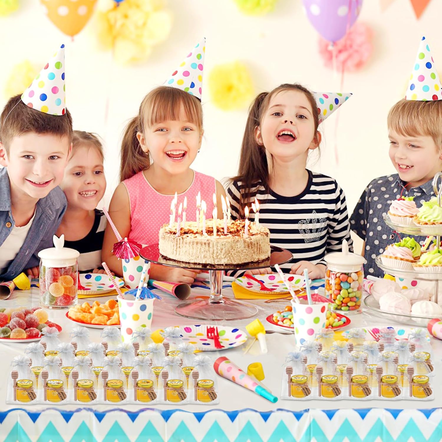 • Great Value Mini Honey Jars Set: This set includes 126 round mini honey jars with dippers, lids, stickers, bee charms, gift bags, tags, and 50m of jute twine. Everything you need to craft thoughtful party favors or sweet handmade gifts with ease.