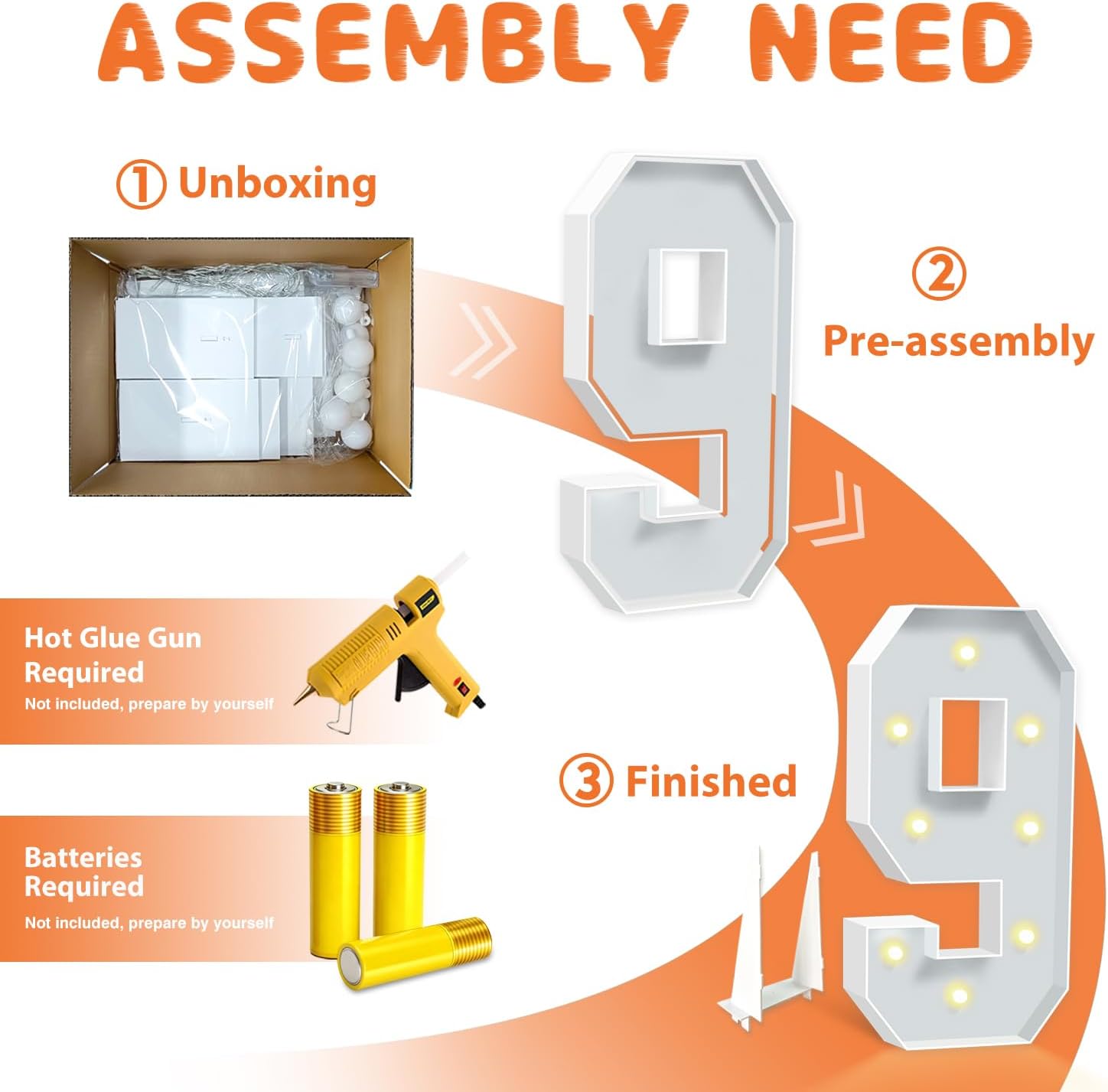 • EASY TO ASSEMBLE: The package includes pre-cut foam boards, light strings and instructions. Each foam board has slots and is numbered, so you can match them according to the 2 same numbers. All you need to do is to prepare a hot glue gun and 3 AA batteries, follow the step-by-step instructions or online video for a hassle-free assembly. Decorate the party with your kids or friends and enjoy the DIY fun. (Note: Glue gun, glue and batteries are not included)