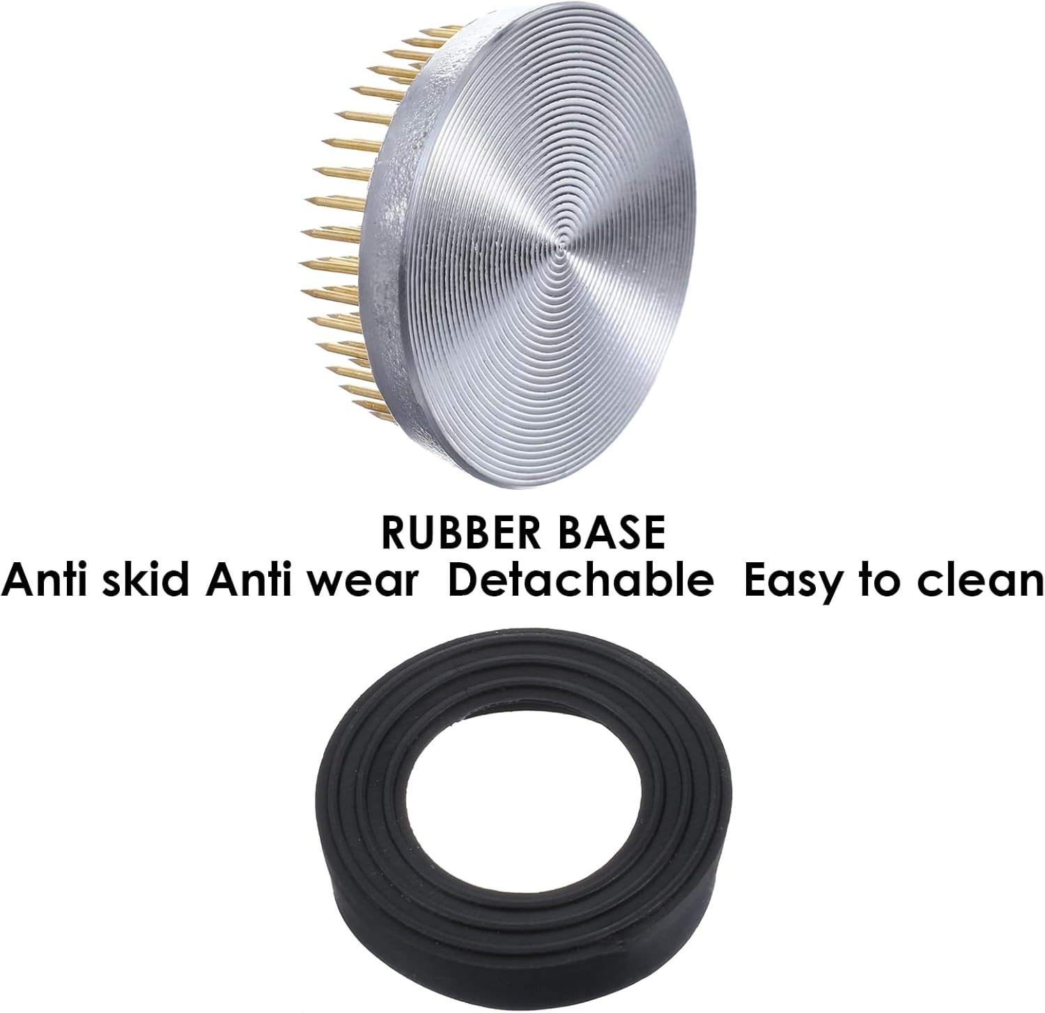 • ★Material. Brass pin and lead base with rubber non-slip pads (Brass is a material that does not rust easily. The surface of the lead base will form a gray surface layer after long-term use, and this surface layer is easily mistaken for rust. But in fact this is a protective film that can extend Kenzan’s life span. Beside, this Kenzan set is equipped with rubber non-slip pads, which can improve the stability of the flower frog and prevent the metal flower frog from damaging the container.