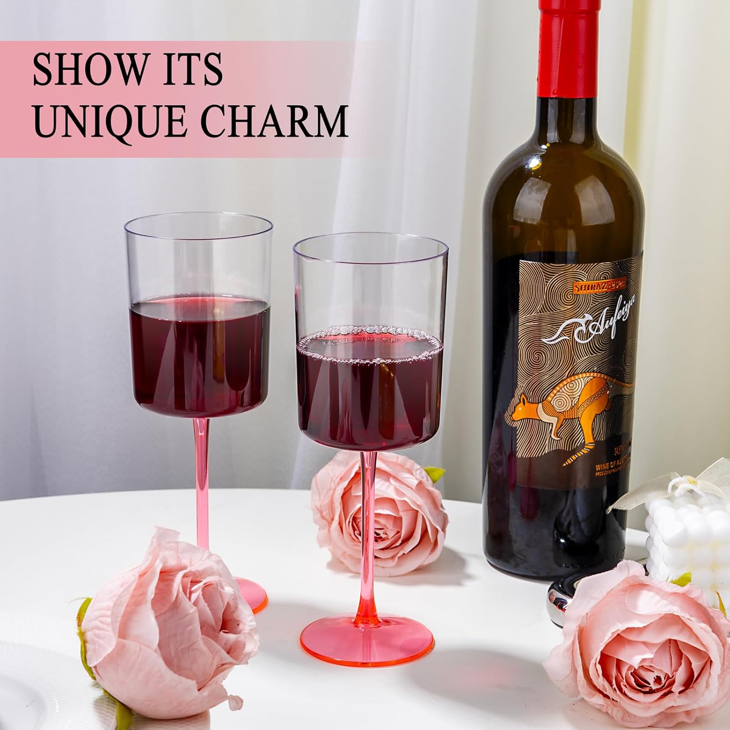 • WIDELY USED: Plastic stemmed wine glasses are suitable for outdoor, party, wedding, barbecue, picnic or car. The limousine industry has transitioned from traditional glassware to plastic for safety reasons. So our square wine glasses are nice choice for you. Our plastic wine glasses with pink stem can be used for whiskey, pink wine, cocktails, lemonade, juice, and even desserts.