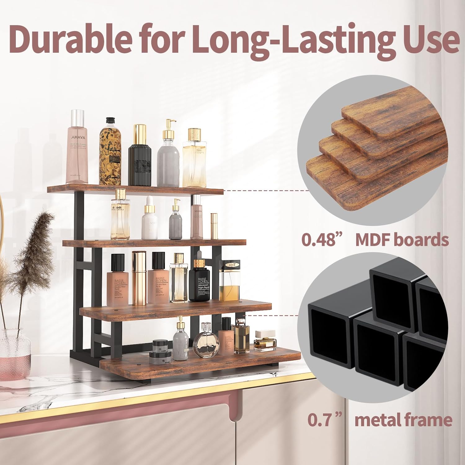 • Sturdy and Reliable Construction: This tiered tray stand, crafted with a reinforced 0.7" metal frame and thick 0.48” MDF boards, offers exceptional durability and stability. The non-slip bottom pads prevent wobbling, ensuring your display stand stays securely anchored during use. Its robust build makes it ideal as a perfume organizer and even an action figure stand.