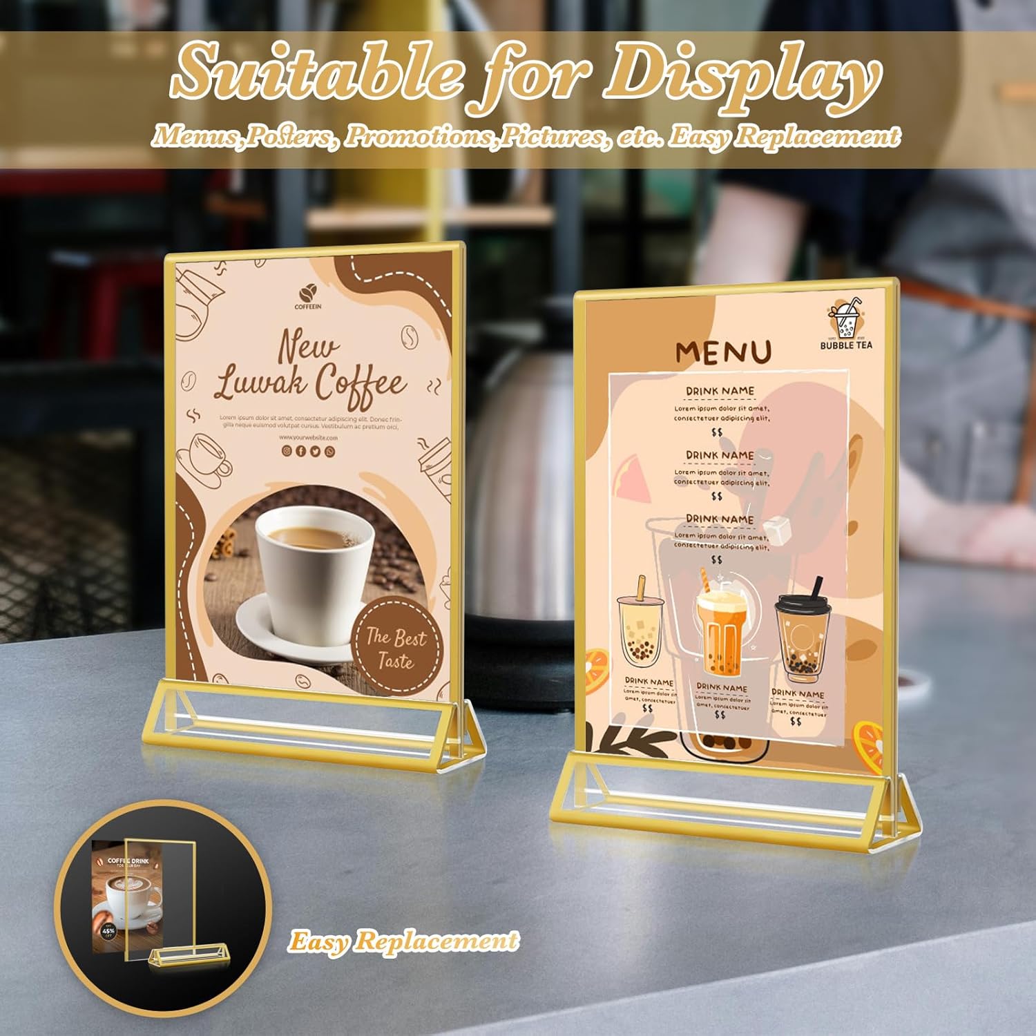 • 【Double-Sided Display Design】This uniquely designed 16 Pack 5x7 gold acrylic sign holder features a back-to-back double-sided display design. Its vertical double-sided structure ensures clear visibility of two photos or menu signs, making your table arrangement practical and visually appealing from any angle.