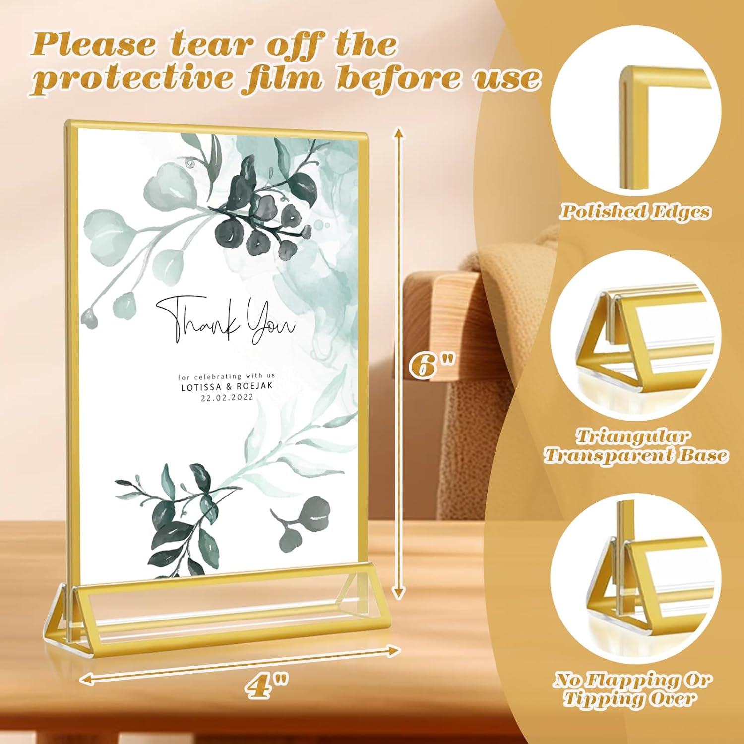 • 【Wide Application 】This set of 16 Pack 4x6 frame acrylic gold sign holders combines functionality with aesthetic appeal, ideal for elevating the ambiance of diverse events like weddings, baby showers, birthday parties, hotels, restaurants, cafes. This 4x6 gold frame with gold trim will be a great way to cherish special memories in your home or as part of a table set up on your big day.
