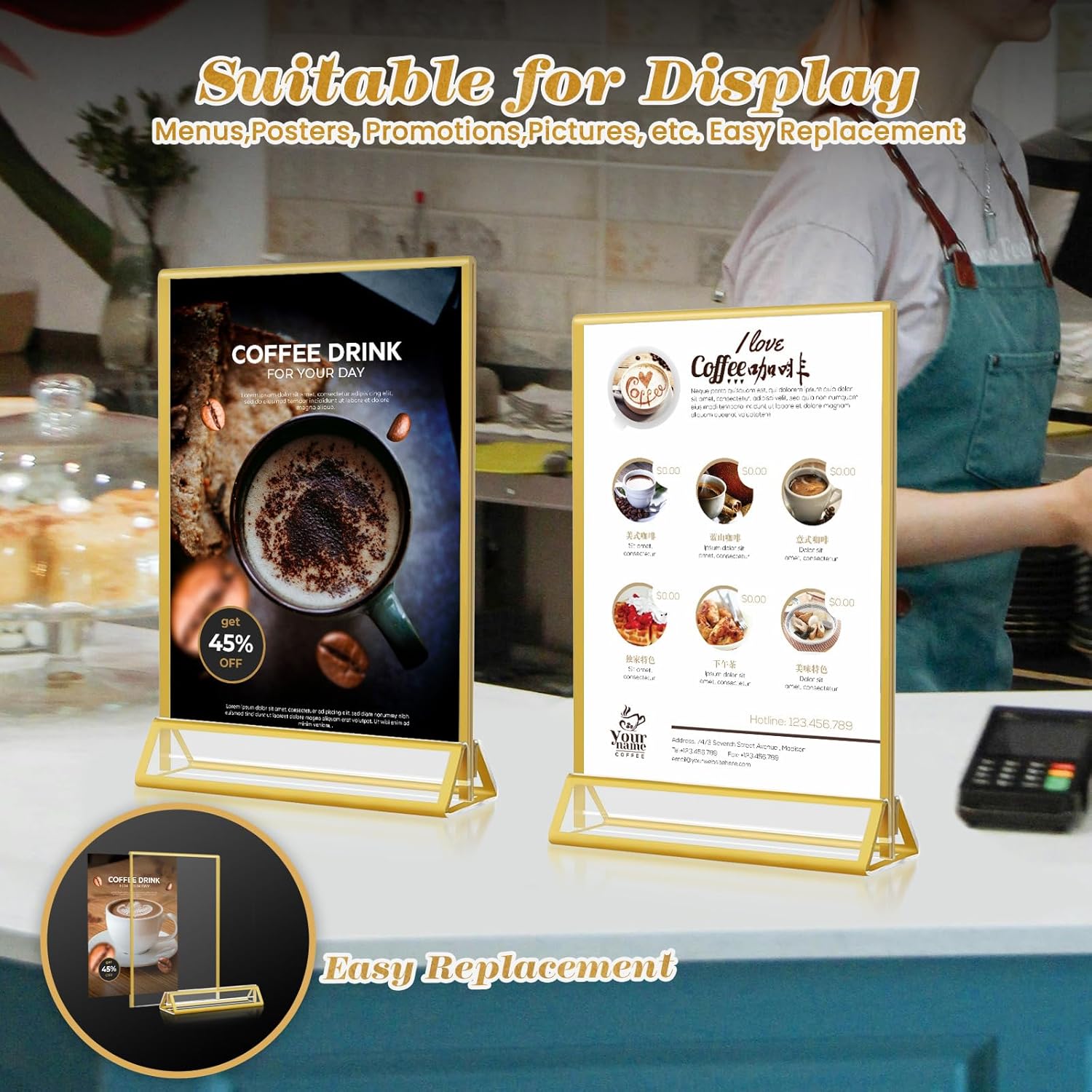 • 【Double-Sided Display Design】This uniquely designed 16 Pack 4x6 gold acrylic sign holder features a back-to-back double-sided display design. Its vertical double-sided structure ensures clear visibility of two photos or menu signs, making your table arrangement practical and visually appealing from any angle.