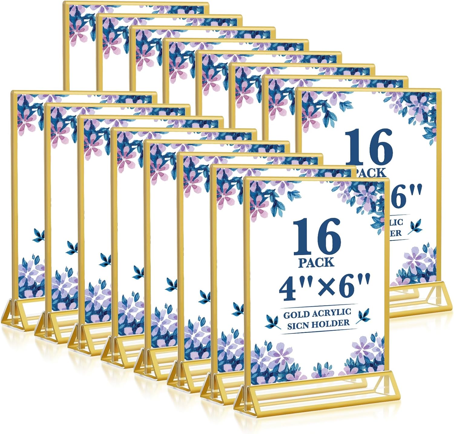 Gold Acrylic Sign Holder 4x6, 16 Pack Wedding Gold Frame Table Number Holders Vertical, Clear Picture Frames Flyer Stands Tables Menu Holder, Double Photo Paper Display Holder for Party, Home, Office