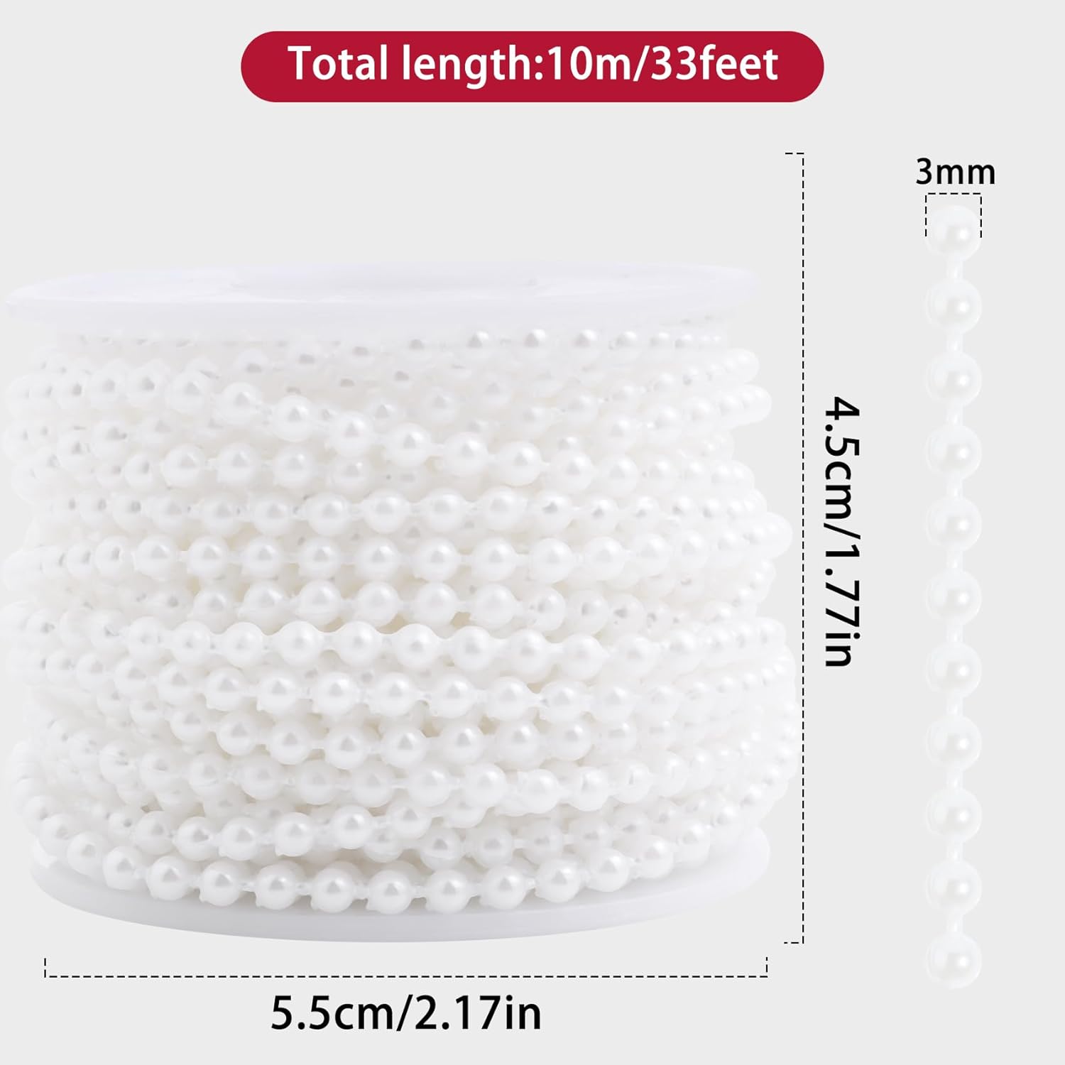 • Size: each roll of pearl chain has a total length of 33 feet/10 metres. The diameter of artificial pearls is 3mm. Please check the size before purchasing
