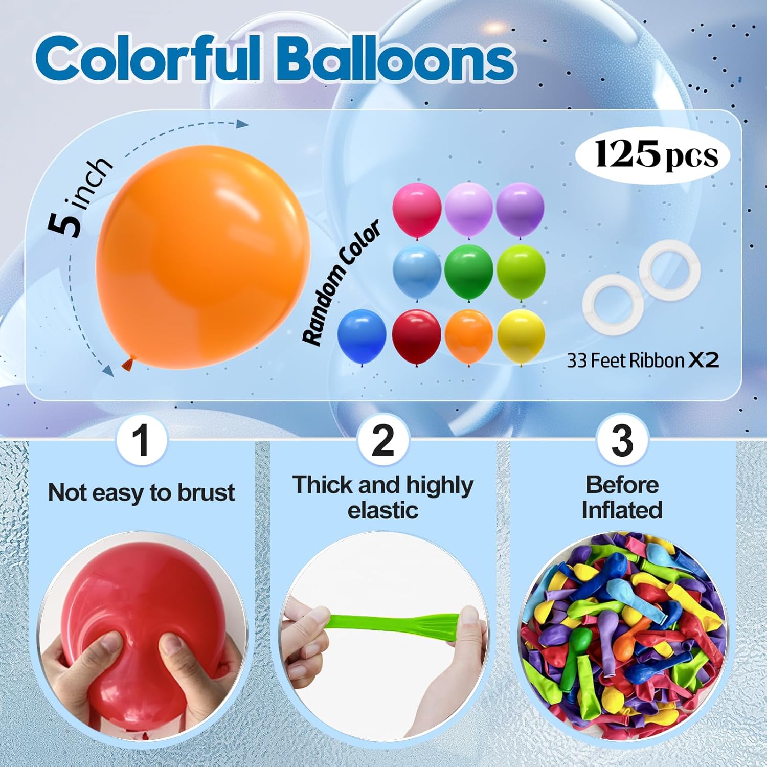 • 【Size & Quantity】 Each sets contains 125pcs 5 inch small balloons, the latex balloons is various colors(Delivered randomly), mini rainbow balloons are safe, heavy thick, bouncy and Eco-friendly latex material which is durable and long-lasting quality, these balloons Thicker and much strong than typical balloons for longer lasting fun.