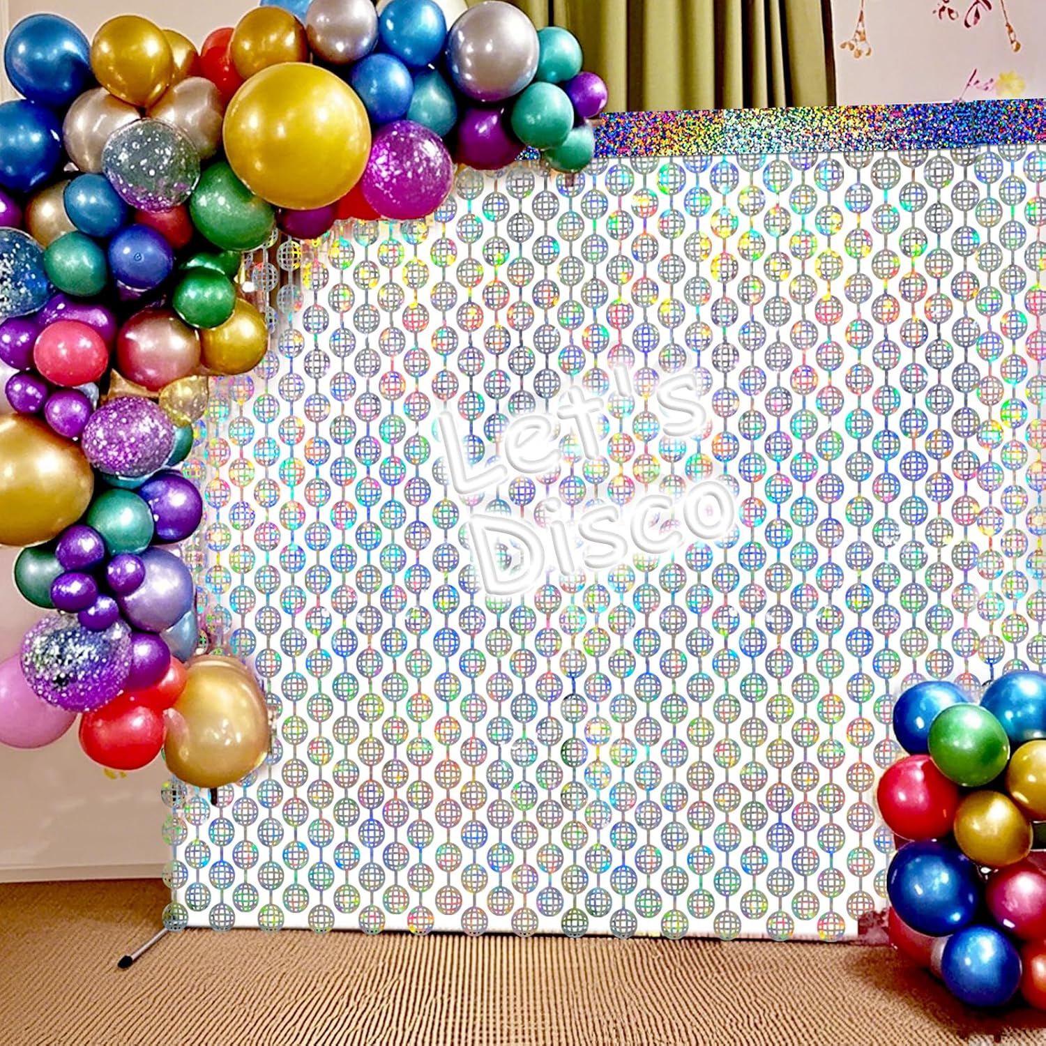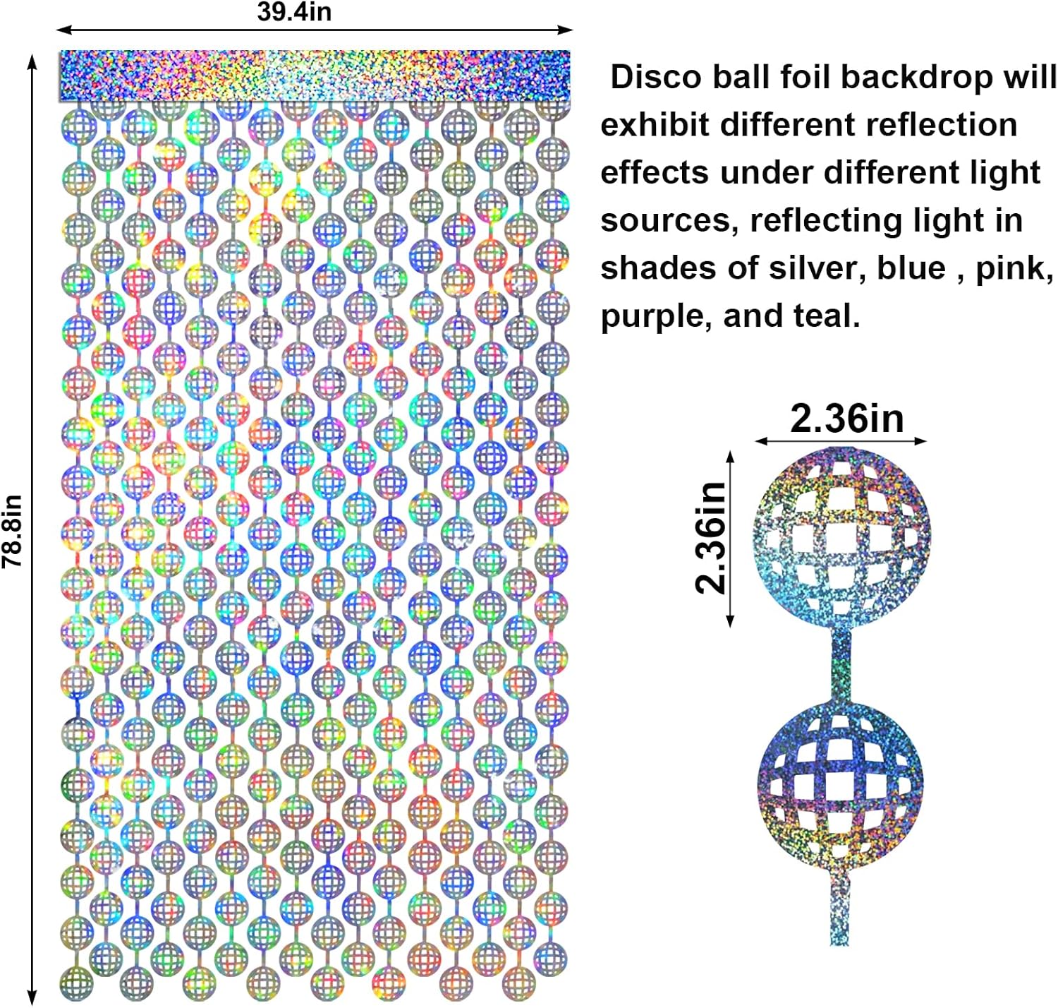 • Shiny Holographic Design: Different from usual disco backdrop, our disco ball backdrop features a shiny holographic design, and it shows different color effects under different light, reflecting light in shades of silver, blue , pink, purple, and teal, that creates an eye-catching and mesmerizing effect. Perfect for the doorway, window, wall, living room, dessert table backdrop, and stage background decorations.