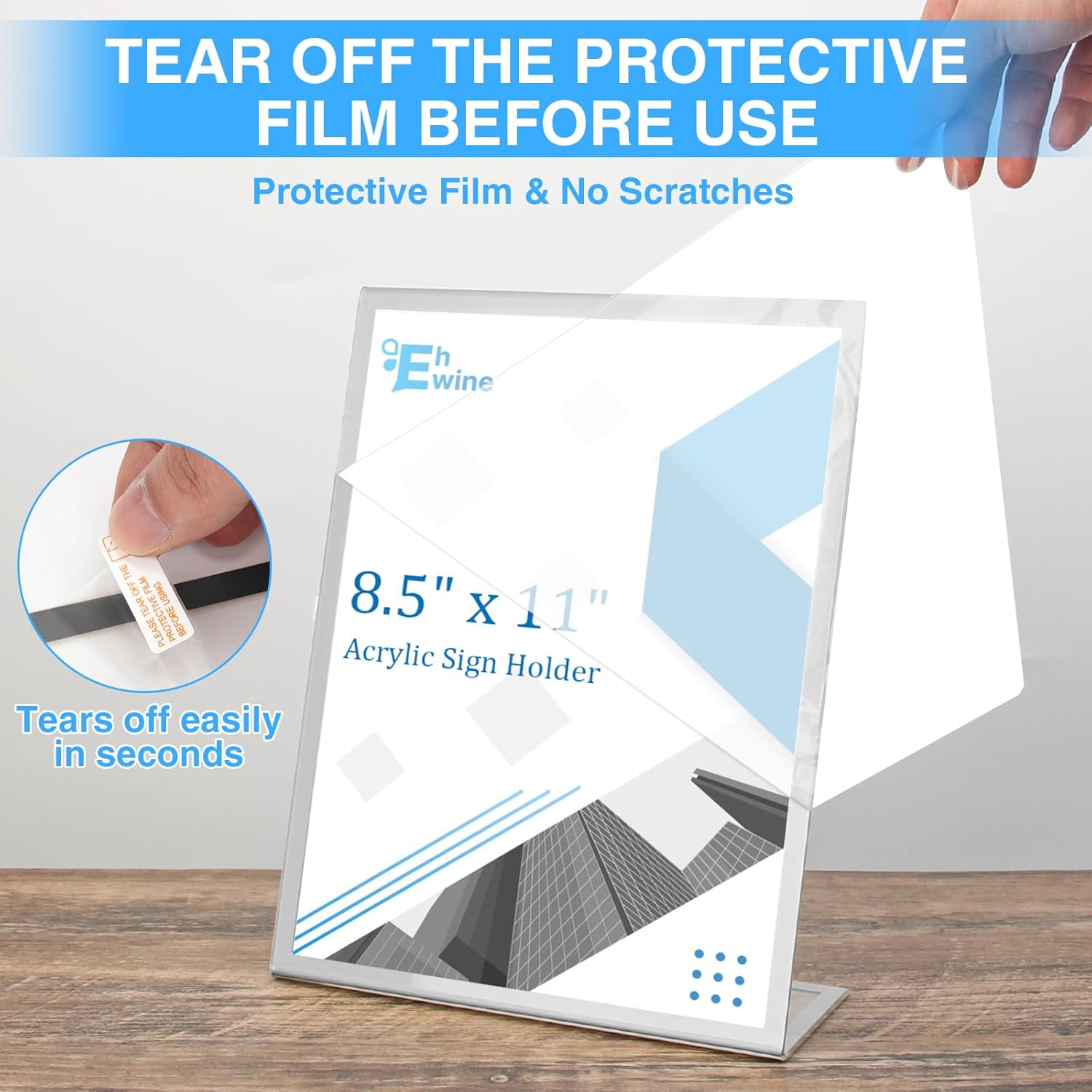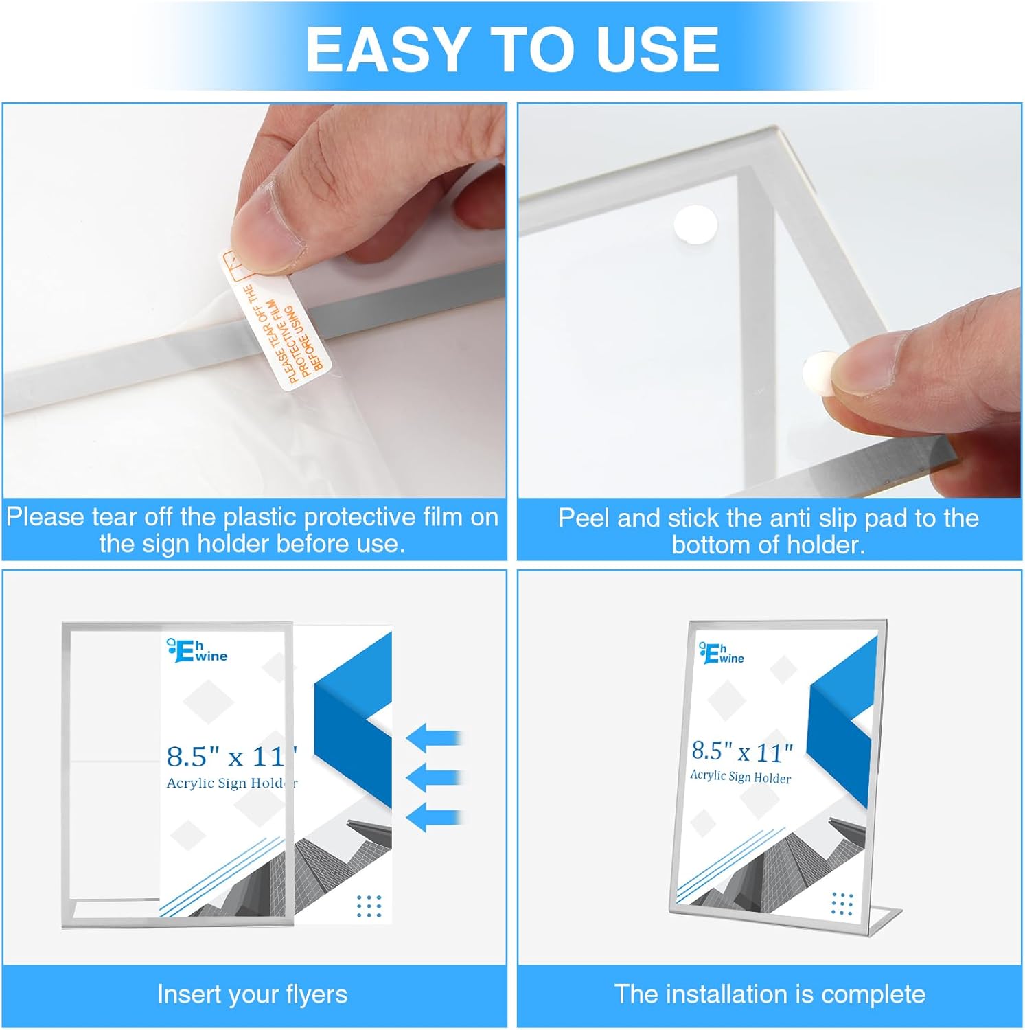 • Easy to Use: Insert 4 anti-slip pads into the base, Each of our Acrylic Sign Holder comes with a peel off film guide, follow the red arrows to peel off the film in seconds, and the plastic sign holder has an opening on its side for easy paper insertion