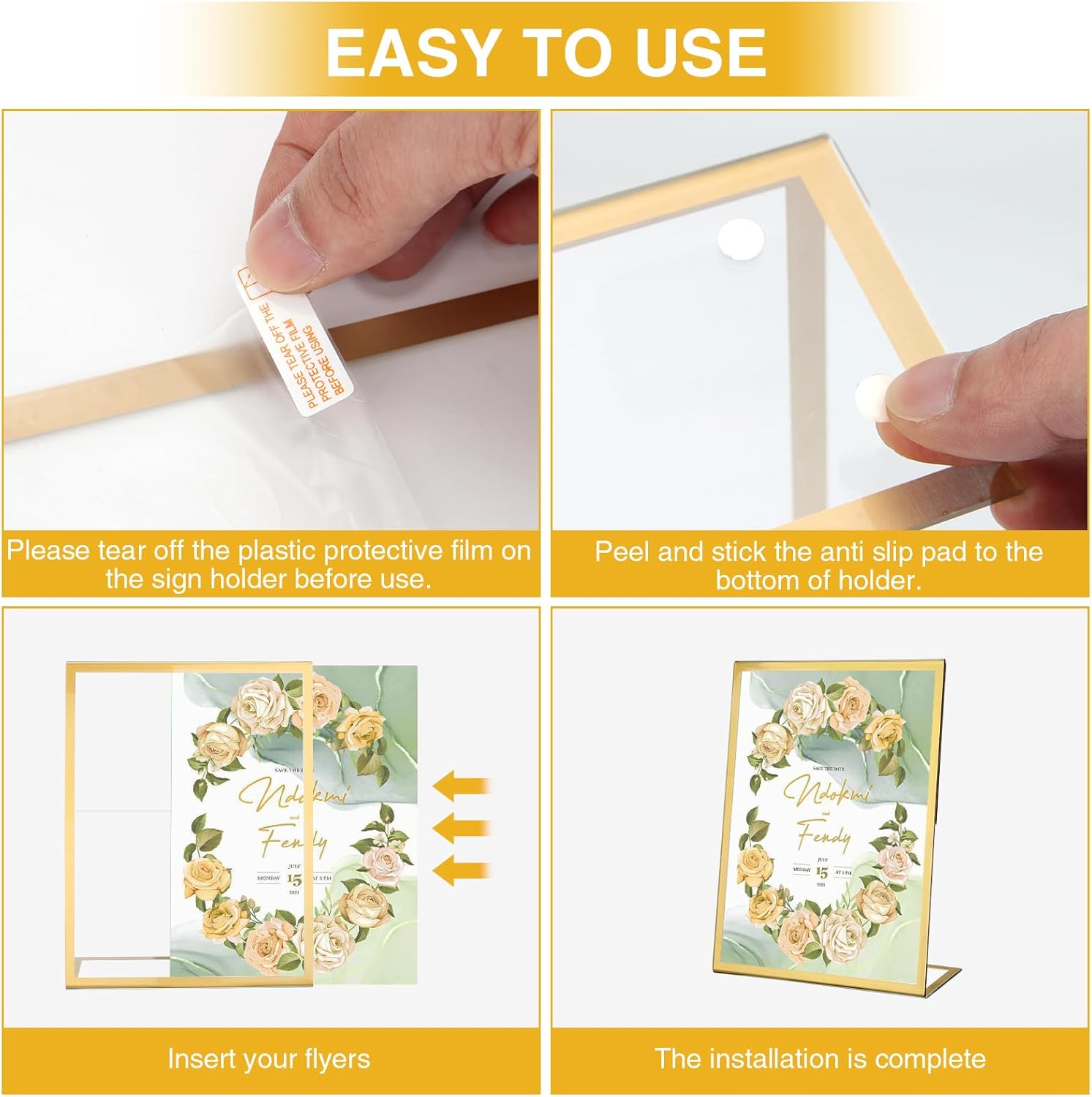 • Easy to Use: Insert 4 anti-slip pads into the base, Each of our Acrylic Sign Holder comes with a peel off film guide, follow the red arrows to peel off the film in seconds, and the plastic sign holder has an opening on its side for easy paper insertion