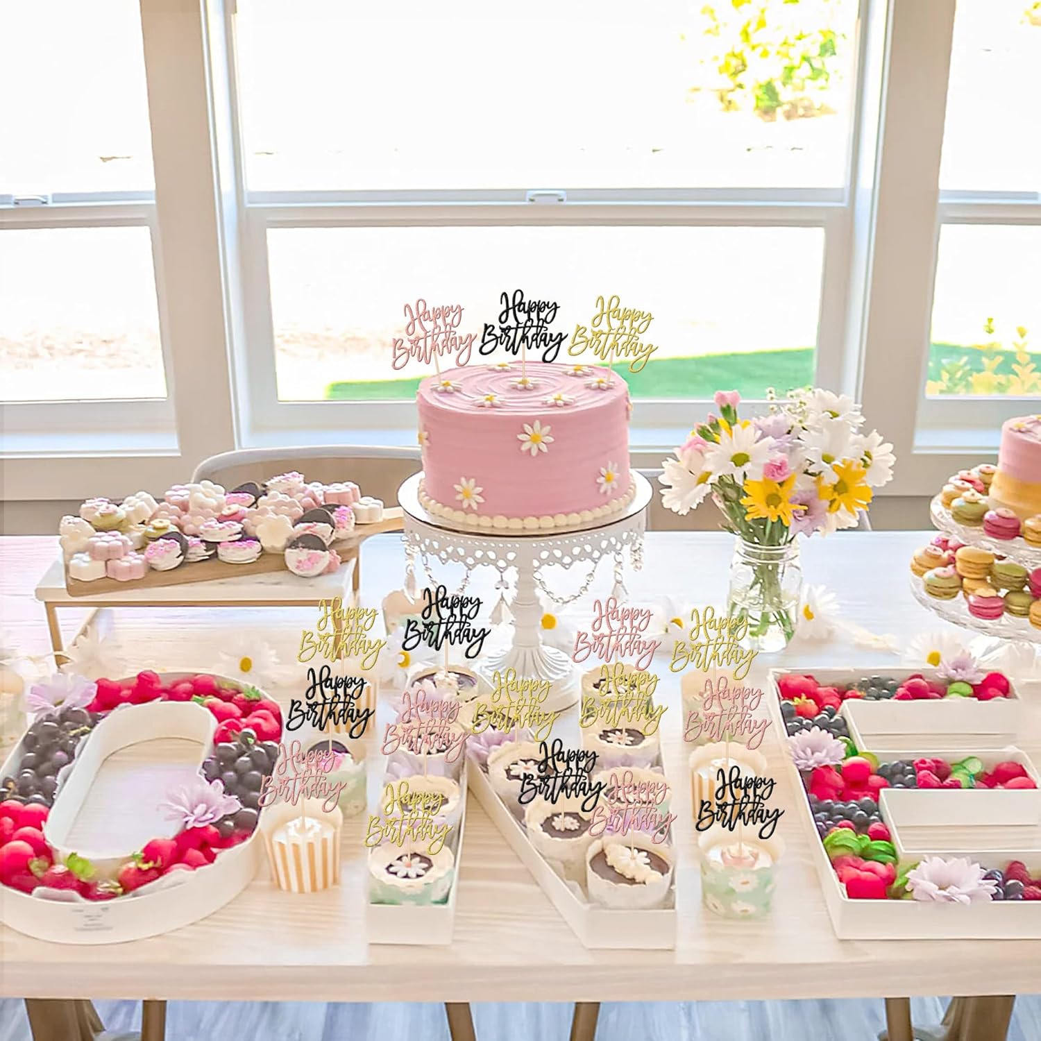 24 PCS Happy Birthday Cupcake Toppers Glitter Happy Birthday Cupcake Picks for Celebrating Anniversary Theme Party Cake Decorations Supplies Gold Black Rose Gold
