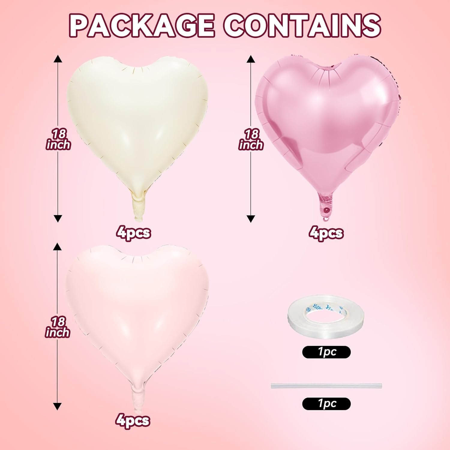 • Pink White Heart Balloons:This 18 inches heart shaped balloons includes 4* pink heart balloons, 4* pastel pink heart balloons, 4* white heart balloons, 1* ribbon, 1*straw, adding romance and warmth to your celebration. These large heart balloons will be the highlight of your party decorations, creating an atmosphere of love for everyone.