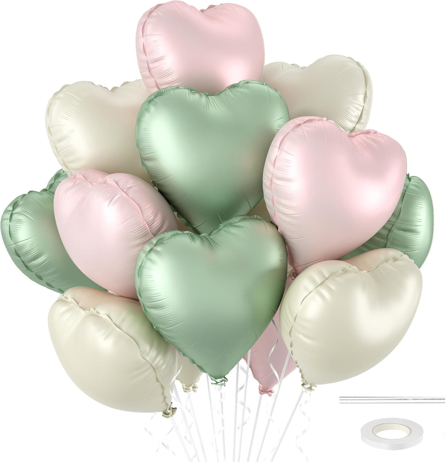 • Sage Green Pink Heart Balloons:This 18 inches heart shaped balloons includes 4* sage green heart balloons, 4* retro pink heart balloons, 4* cream white heart balloons, 1* ribbon, 1*straw, adding romance and warmth to your celebration. These large heart balloons will be the highlight of your party decorations, creating an atmosphere of love for everyone.