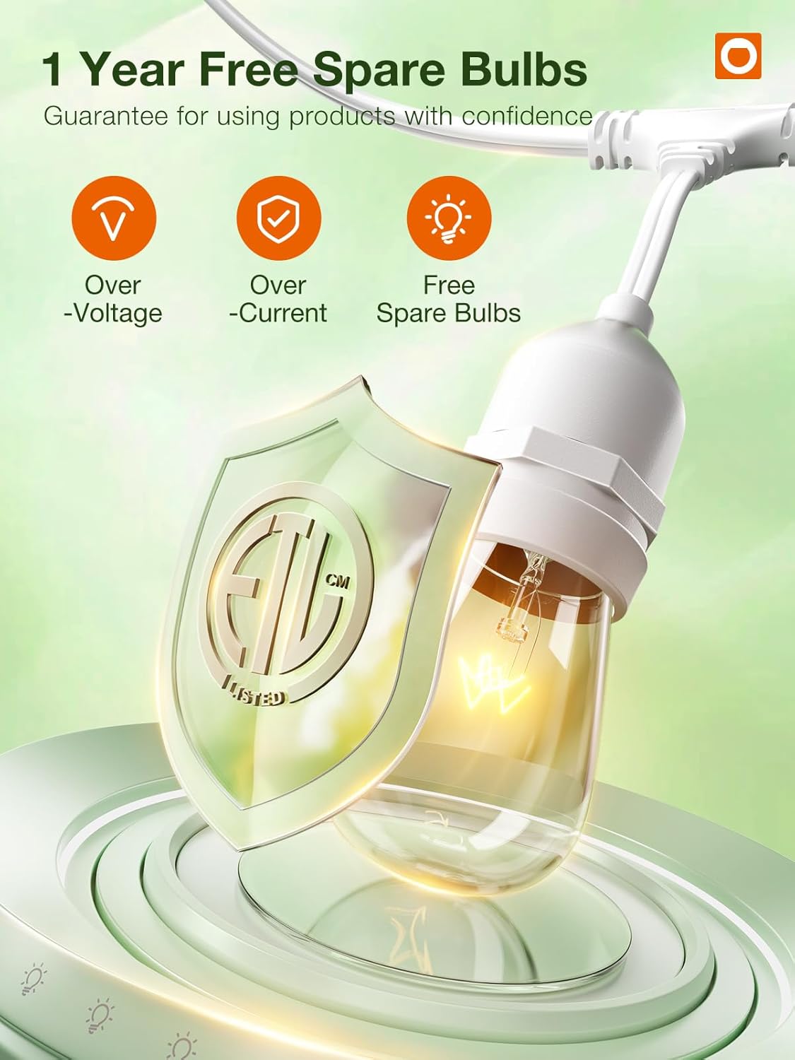 • Weatherproof & Heavy-duty: This outdoor string lights are ETL listed weatherproof commercial. The insulation material can protect the strand from hot winter, sun, wind, rain, snow and damp. Flexible heavy-duty cord withstands the wear of indoor and outdoor use